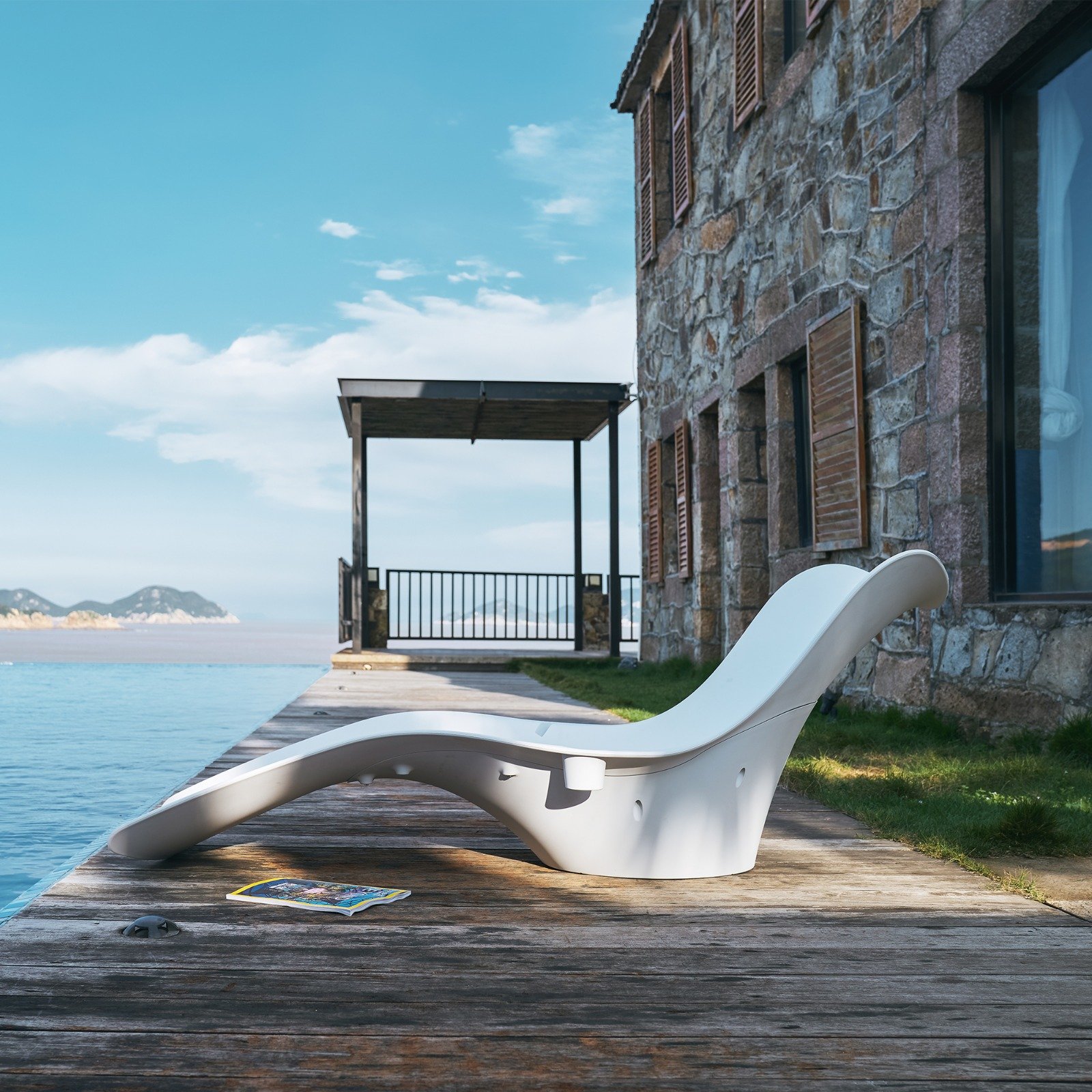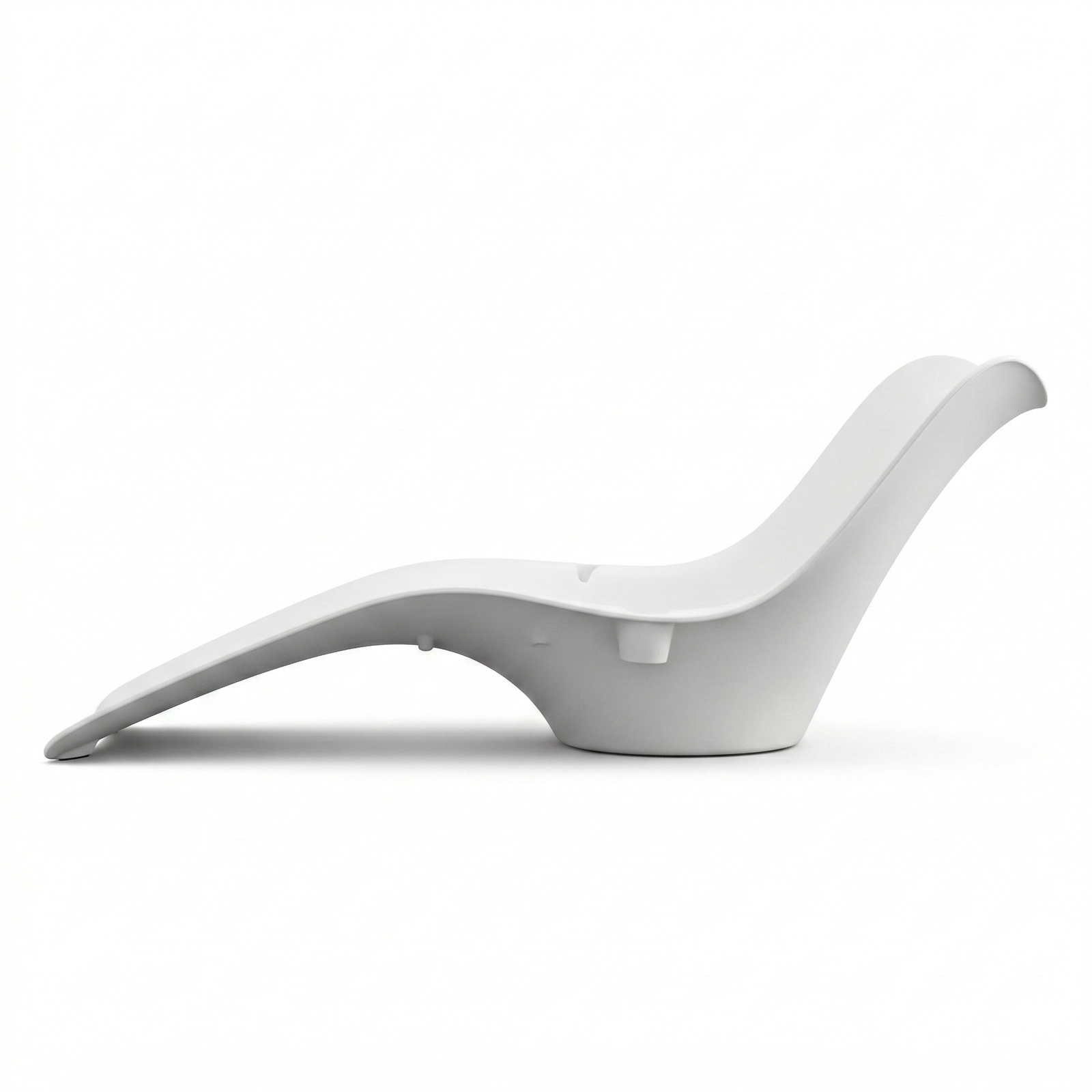 Lettino prendisole monoblocco dal design scultoreo e contemporaneo, pensato per arredare con stile spazi outdoor, piscine, terrazze e zone relax. Le sue linee fluide e sinuose creano una silhouette moderna ed elegante, capace di valorizzare qualsiasi ambiente esterno con un’estetica minimale e ricercata. Realizzato in materiale plastico stampato effetto resina, presenta una finitura bianca liscia e pulita che ne esalta la leggerezza visiva. La seduta ergonomica con profilo ondulato accompagna naturalmente il corpo, offrendo comfort e sostegno grazie alla zona gambe allungata, alla parte centrale incavata e allo schienale integrato leggermente rialzato. La base piena e stabile completa il design con solidità e praticità.