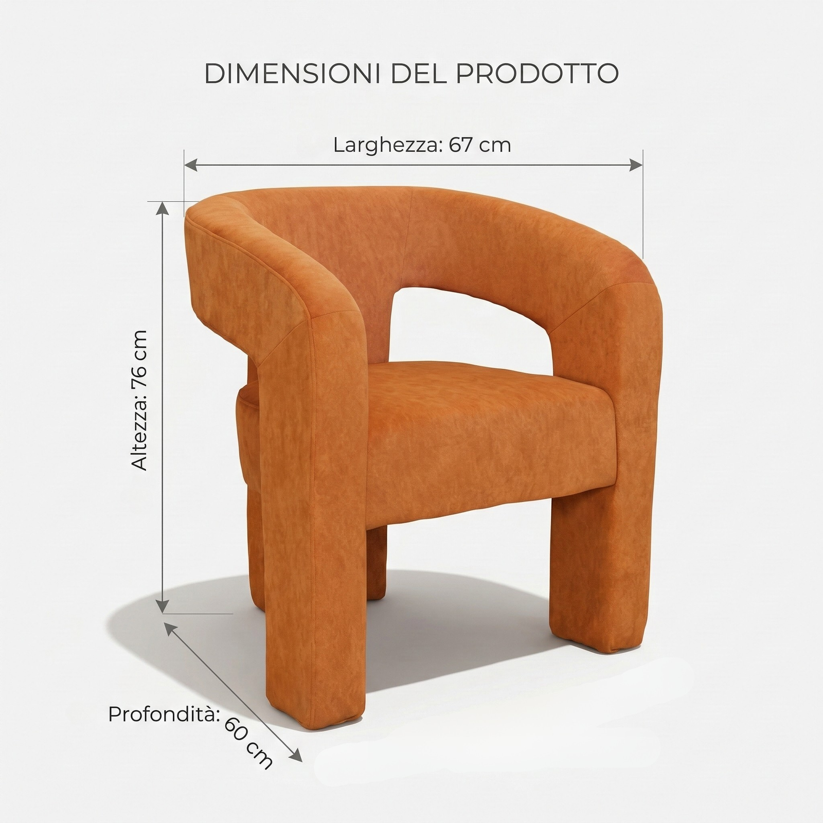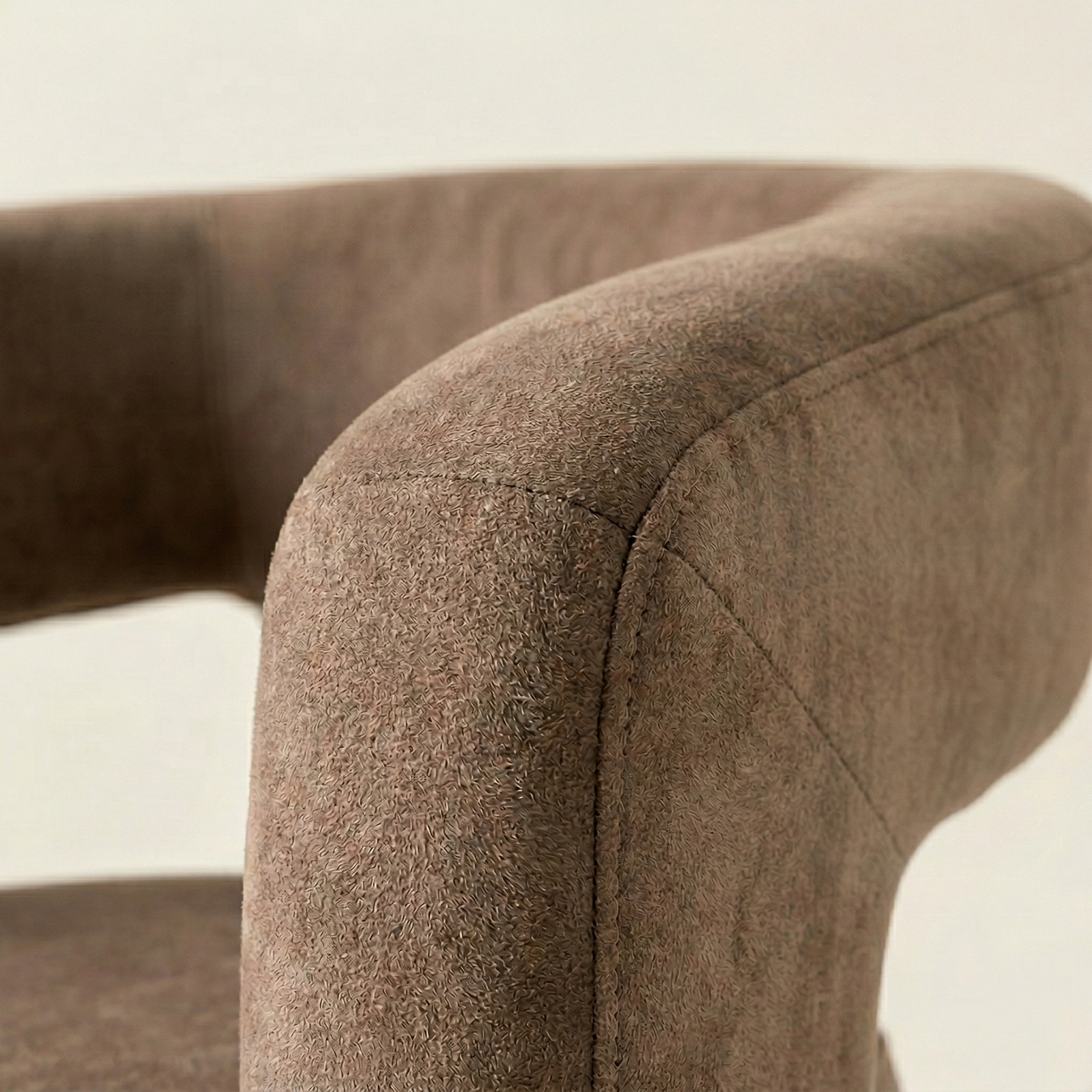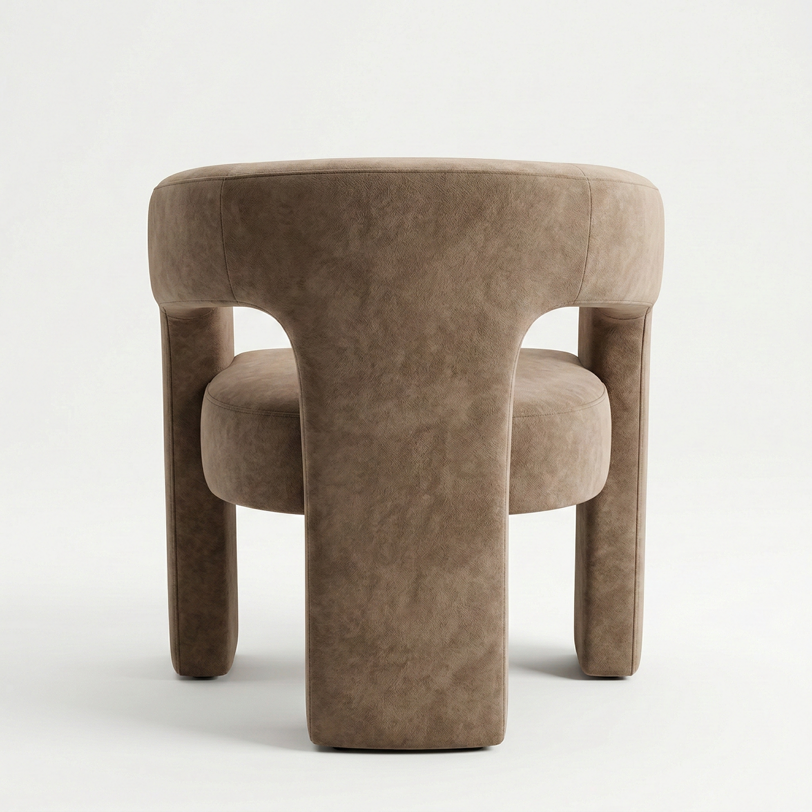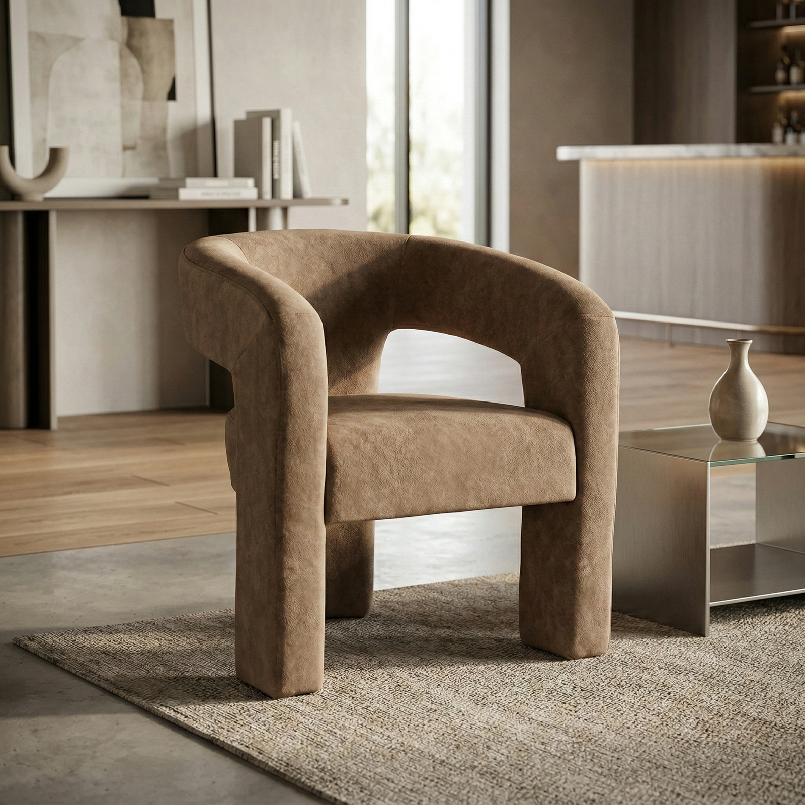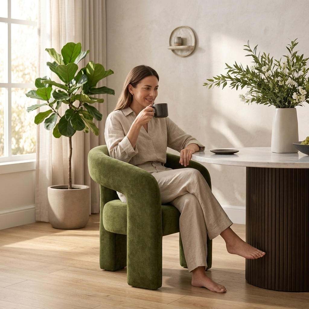 A contemporary, enveloping dining armchair designed to offer maximum comfort and refined style. The fully upholstered frame features soft lines and full volumes that lend the seat an elegant and welcoming feel. The curved backrest blends seamlessly with the armrests, creating a refined and functional shape. The wide, comfortable seat, combined with the integrated base, ensures stability, solidity, and a modern aesthetic with a strong visual impact.