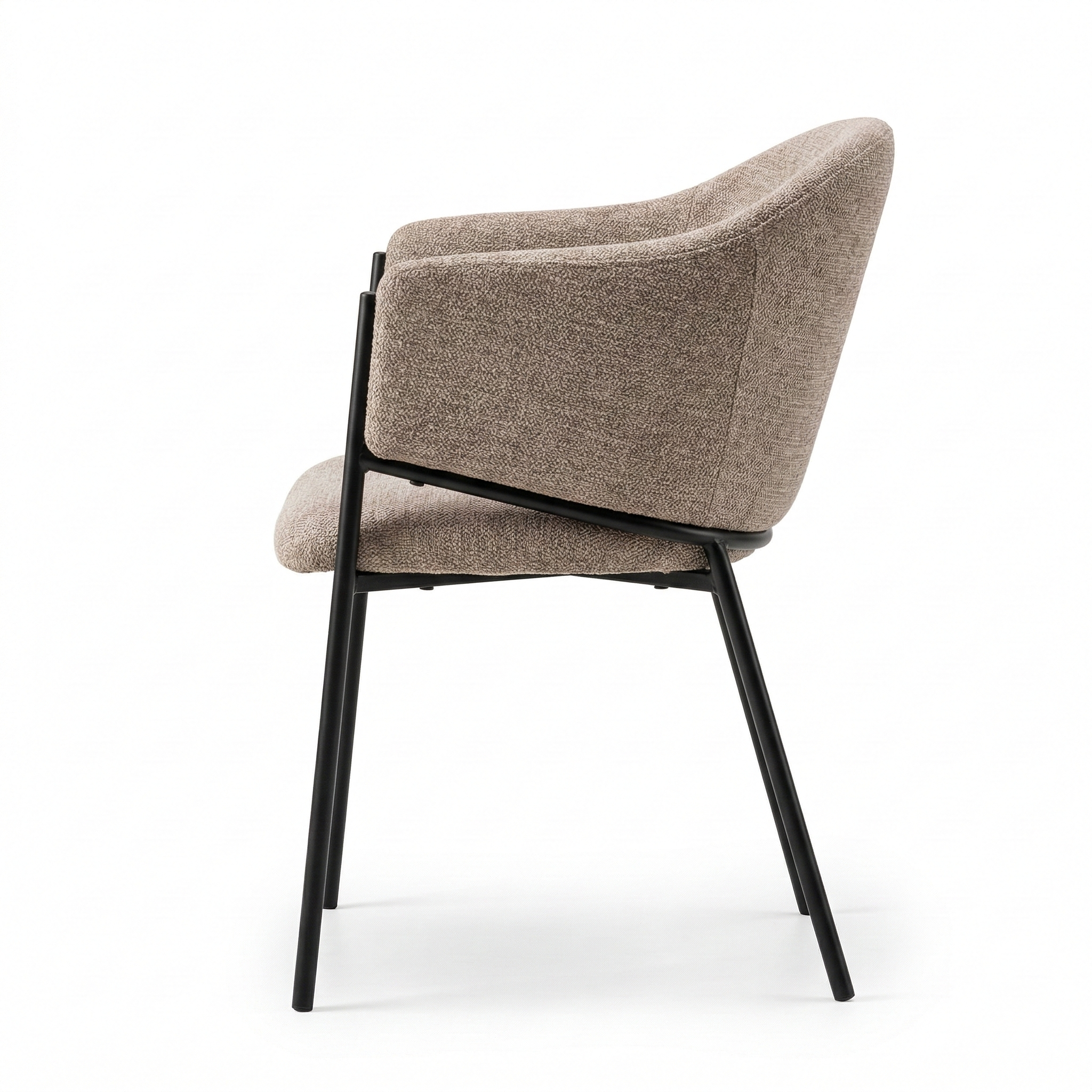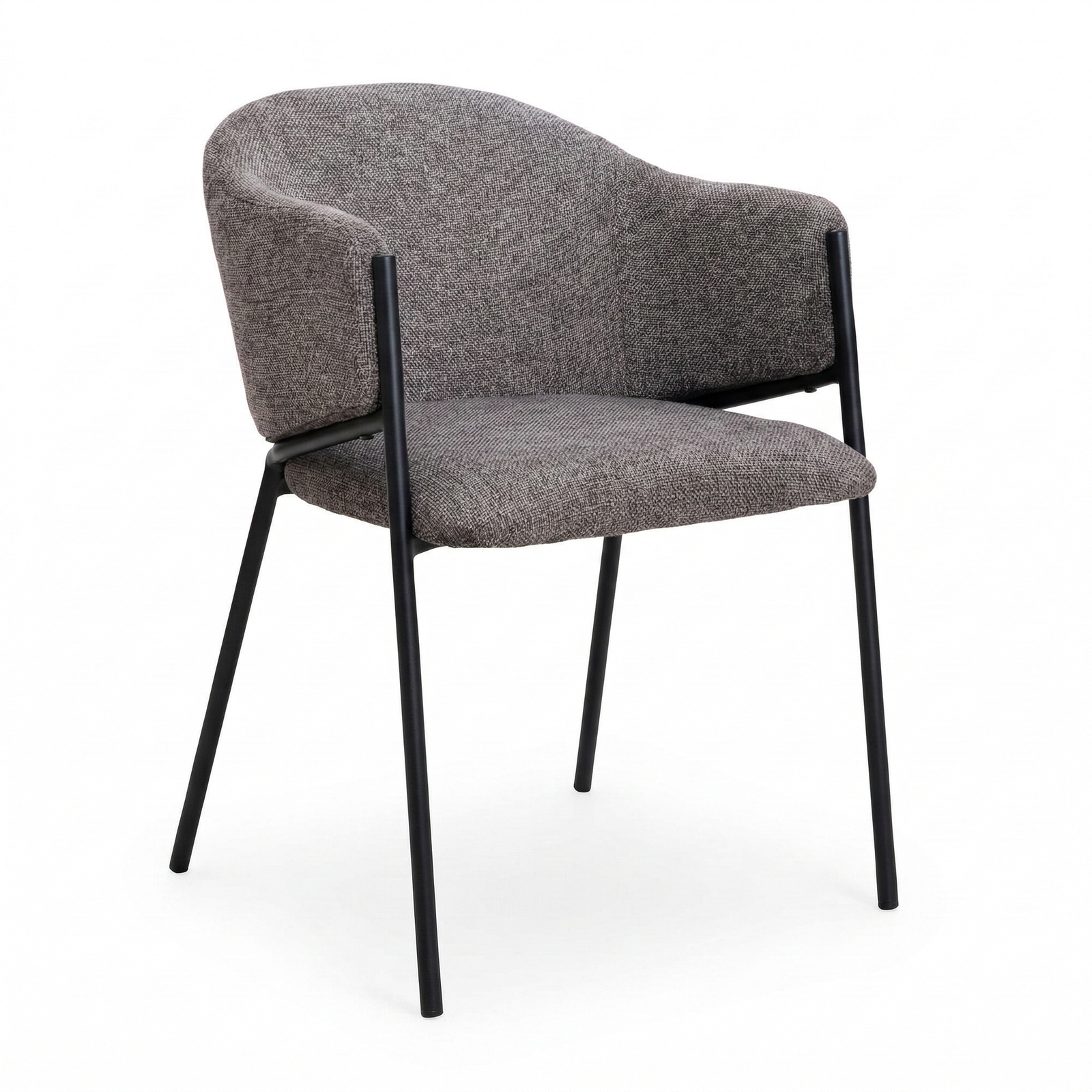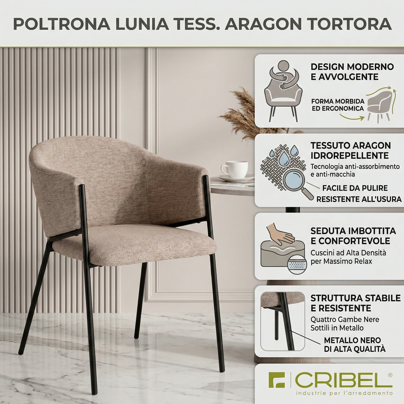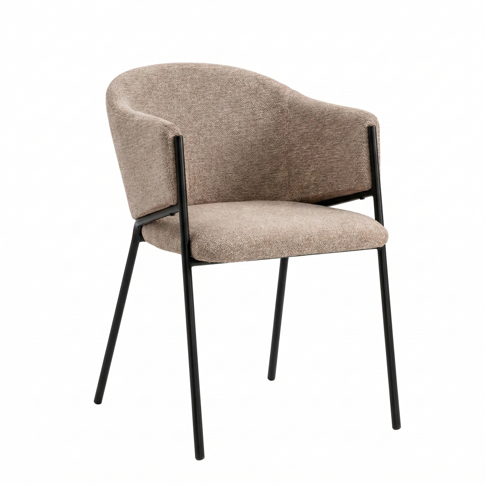 This armchair features a modern and elegant design, ideal for stylishly completing your dining or living area. The wide, padded seat ensures exceptional comfort, while the enveloping backrest with integrated armrests creates a harmonious, soft, and ergonomic shape. The four slender, slightly angled metal legs lend a visual lightness to the structure without sacrificing stability. The Aragon fabric upholstery adds practicality and functionality, thanks to its water-repellent, stain-resistant, and wear-resistant properties, making this armchair the perfect choice for everyday use.