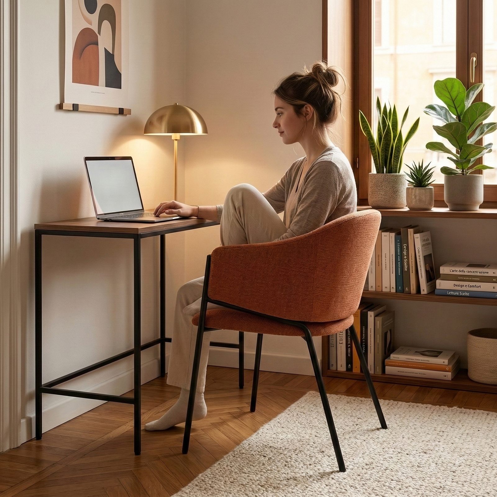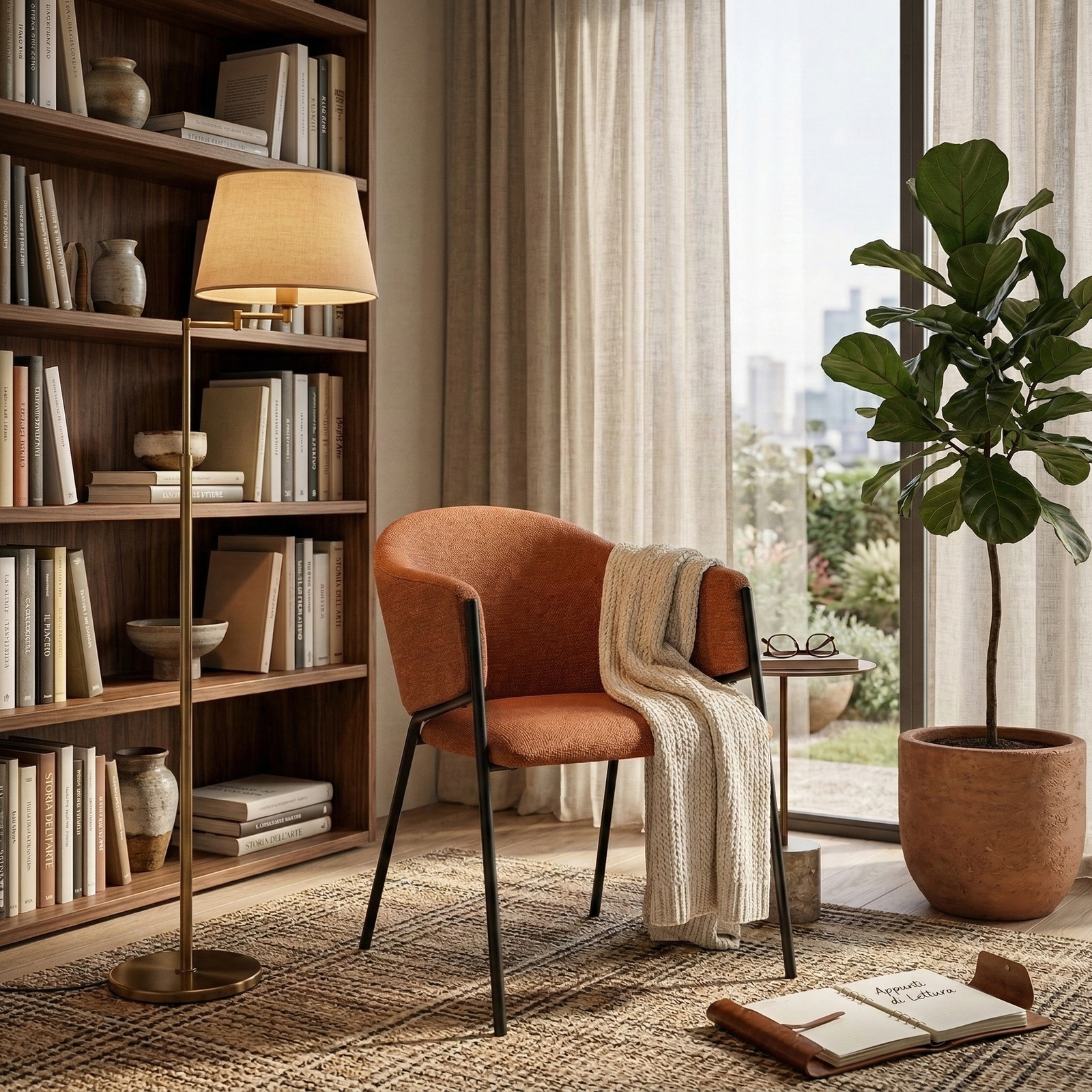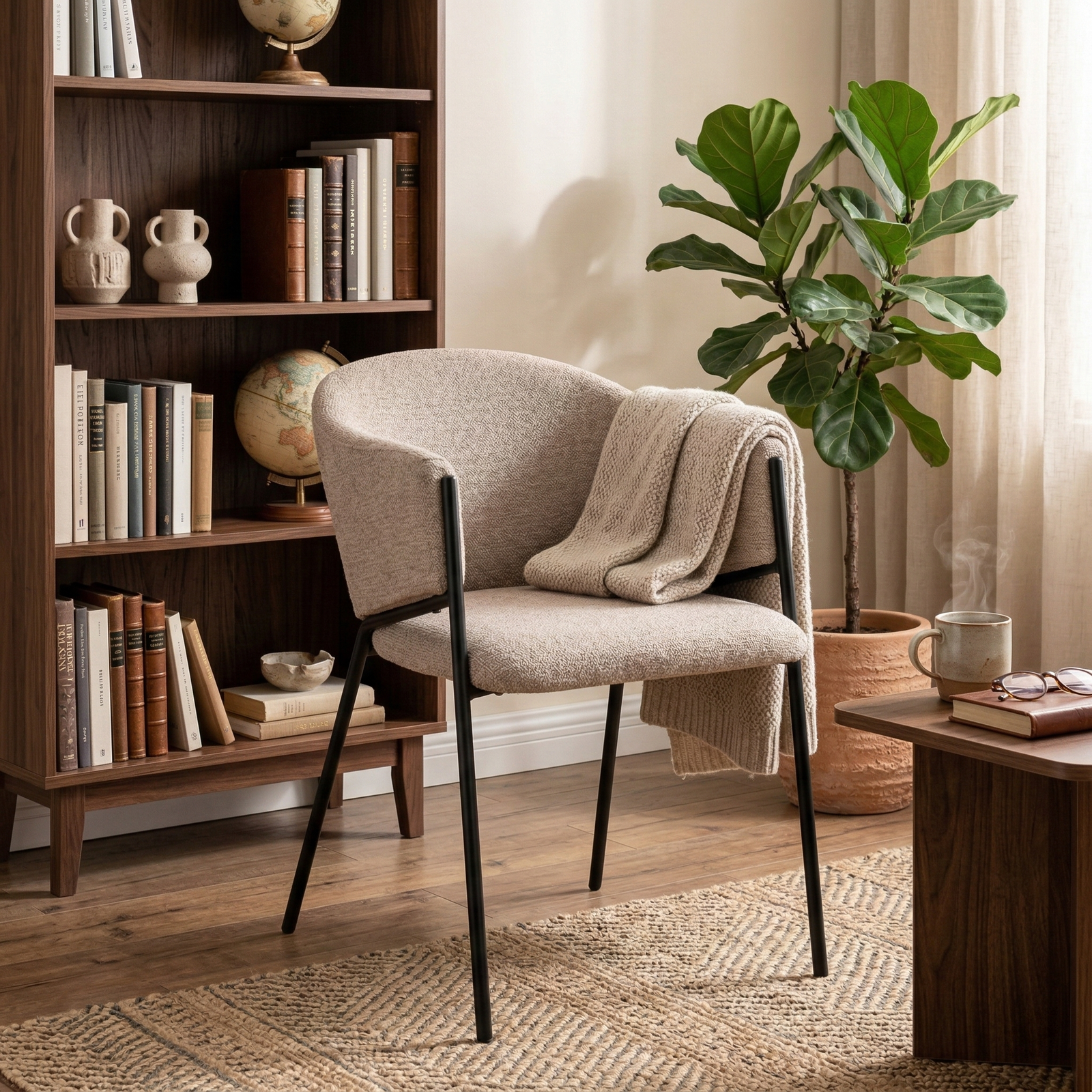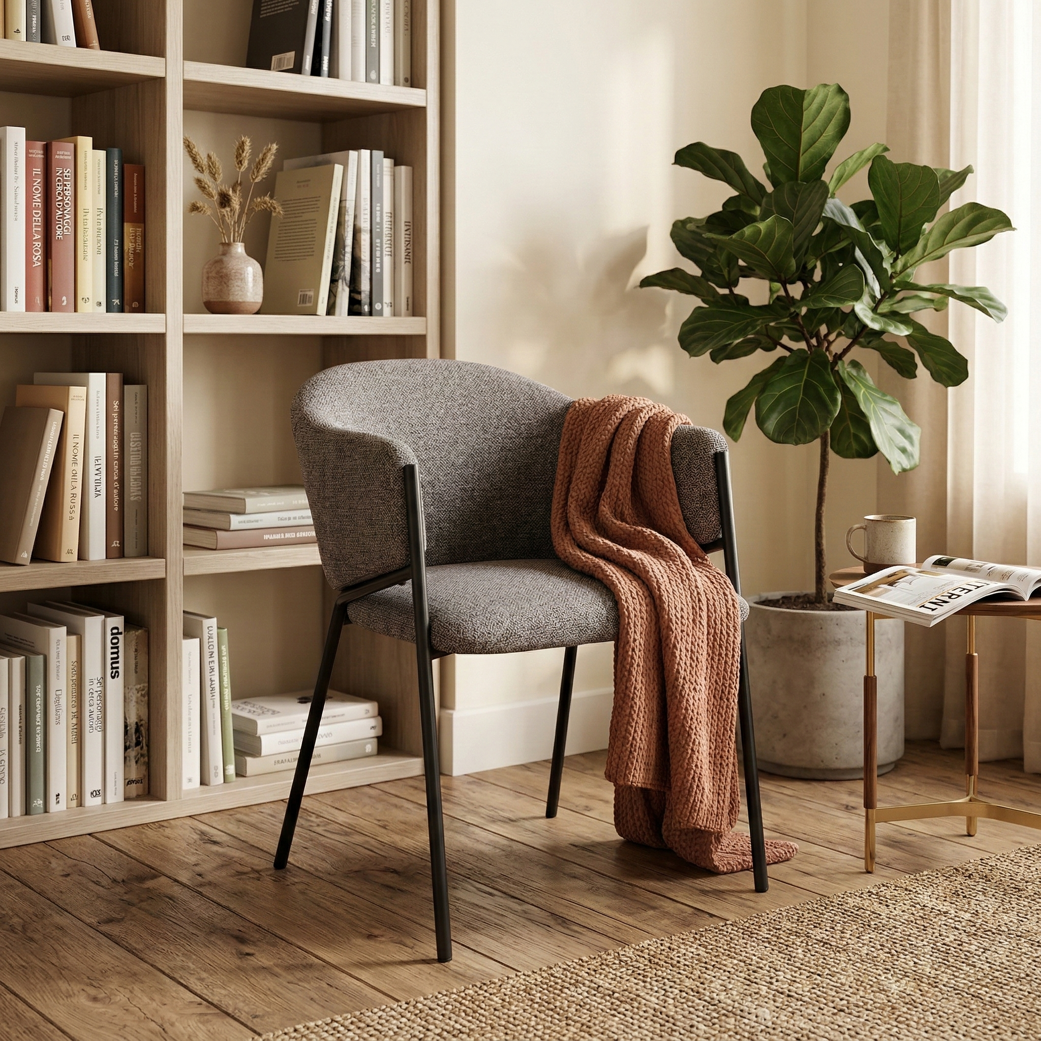 This armchair features a modern and elegant design, ideal for stylishly completing your dining or living area. The wide, padded seat ensures exceptional comfort, while the enveloping backrest with integrated armrests creates a harmonious, soft, and ergonomic shape. The four slender, slightly angled metal legs lend a visual lightness to the structure without sacrificing stability. The Aragon fabric upholstery adds practicality and functionality, thanks to its water-repellent, stain-resistant, and wear-resistant properties, making this armchair the perfect choice for everyday use.