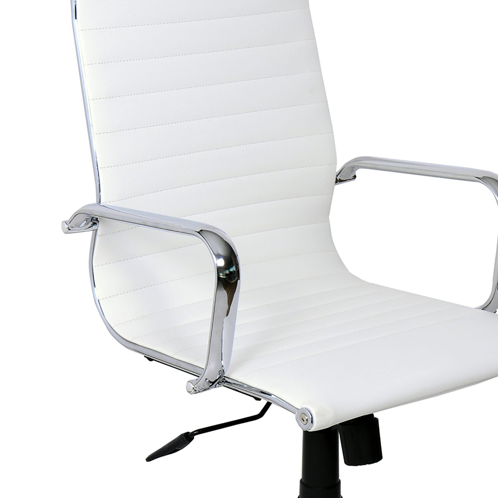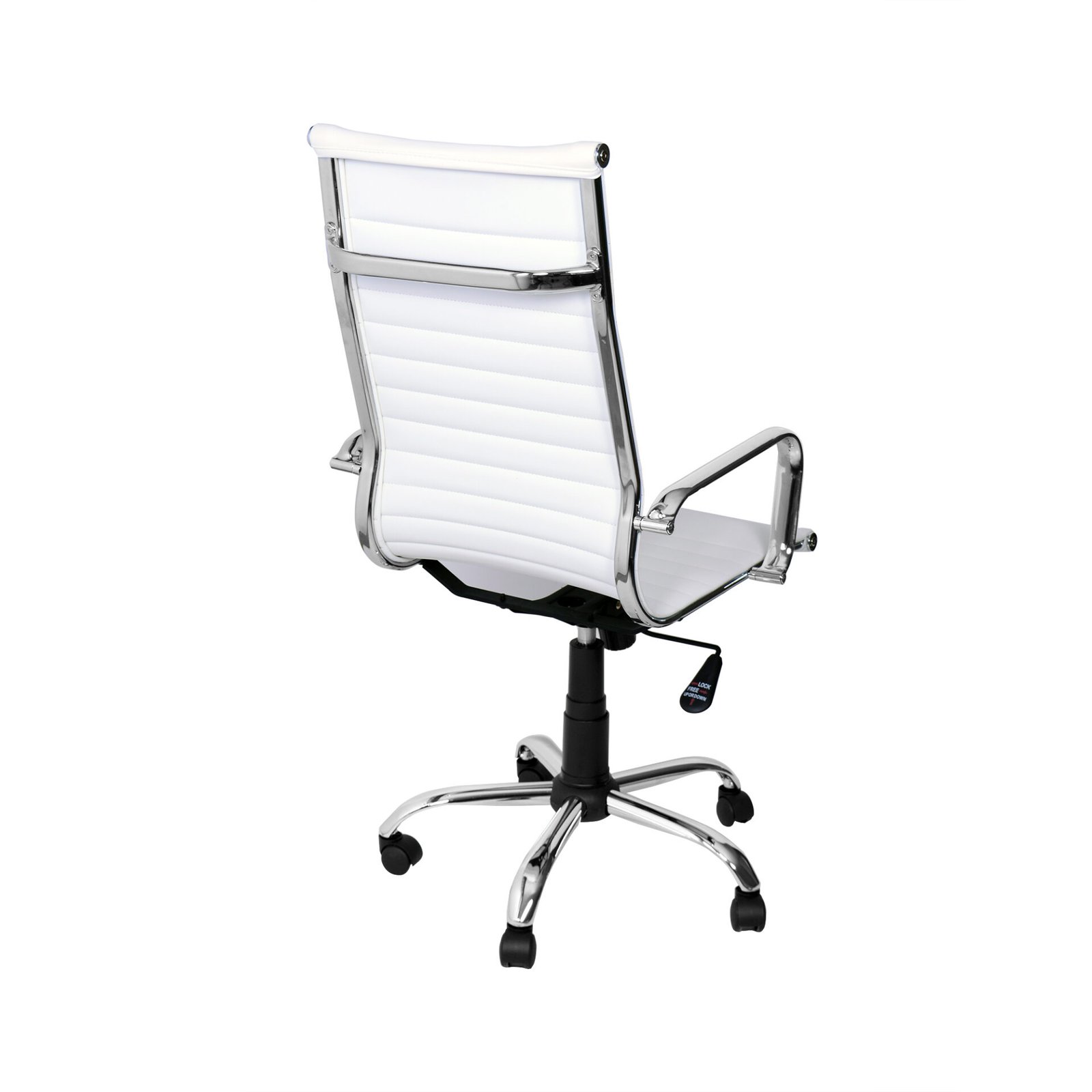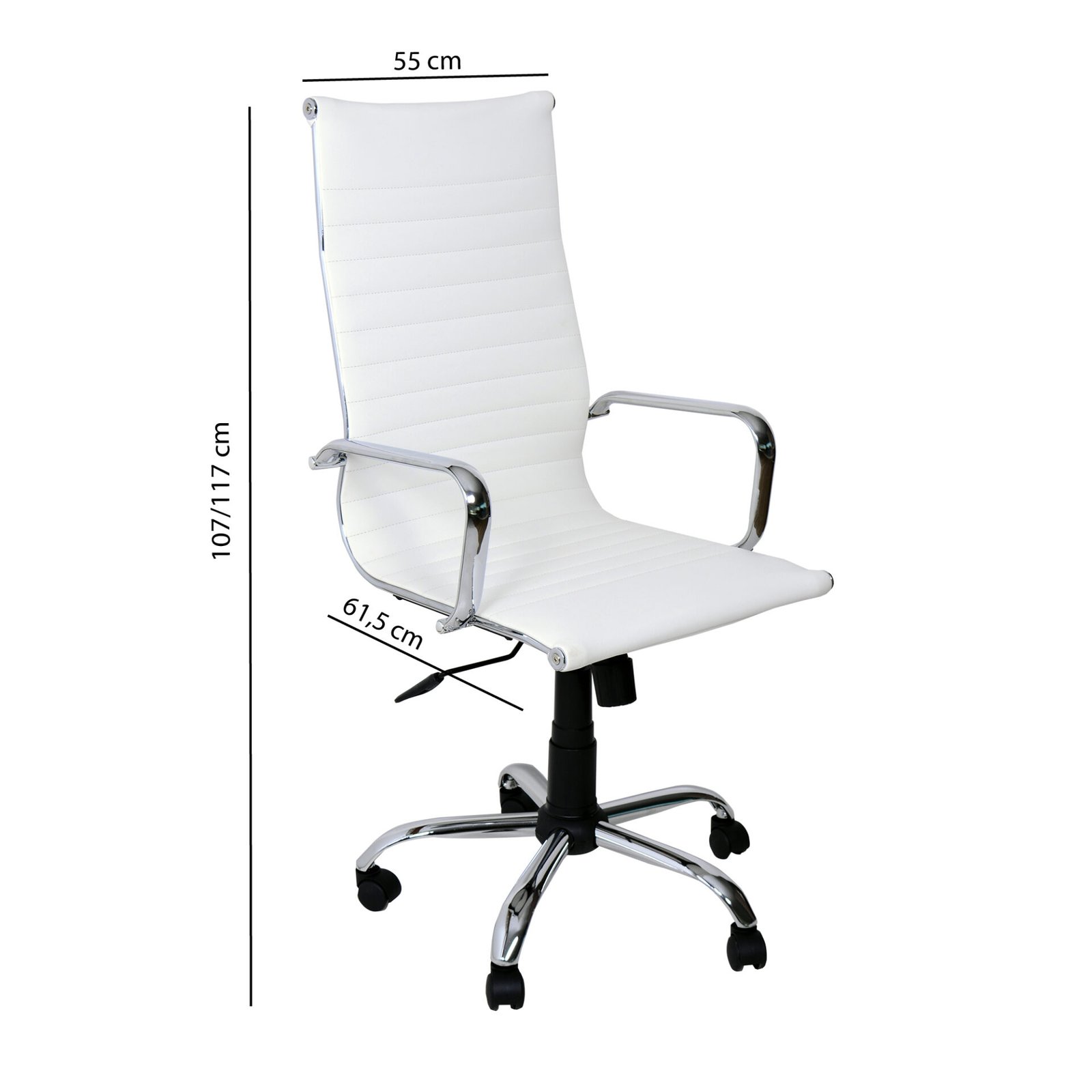 La seduta e l’alto schienale, imbottiti e rivestiti in ecopelle, offrono una comoda seduta e, soprattutto, permettono di mantenere una corretta posizione durante le ore di lavoro. La linea sinuosa della seduta è ripresa dai braccioli cromati, come la struttura. Dotata di meccanismo di elevazione a gas e di meccanismo basculante, attivabile dalla leva posta sotto la seduta, offre confort e comodità. Le sue cinque ruote in ABS permettono di spostarla con facilità. Grazie anche alla scelta cromatica neutra è la sedia perfetta per donare sobrietà alla tuo ufficio e comodità mentre si lavora.