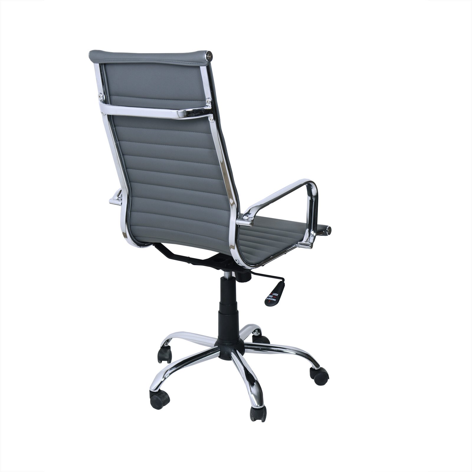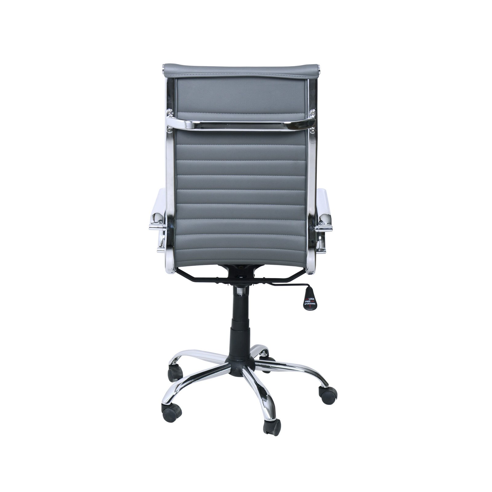 La seduta e l’alto schienale, imbottiti e rivestiti in ecopelle, offrono una comoda seduta e, soprattutto, permettono di mantenere una corretta posizione durante le ore di lavoro. La linea sinuosa della seduta è ripresa dai braccioli cromati, come la struttura. Dotata di meccanismo di elevazione a gas e di meccanismo basculante, attivabile dalla leva posta sotto la seduta, offre confort e comodità. Le sue cinque ruote in ABS permettono di spostarla con facilità. Grazie anche alla scelta cromatica neutra è la sedia perfetta per donare sobrietà alla tuo ufficio e comodità mentre si lavora.