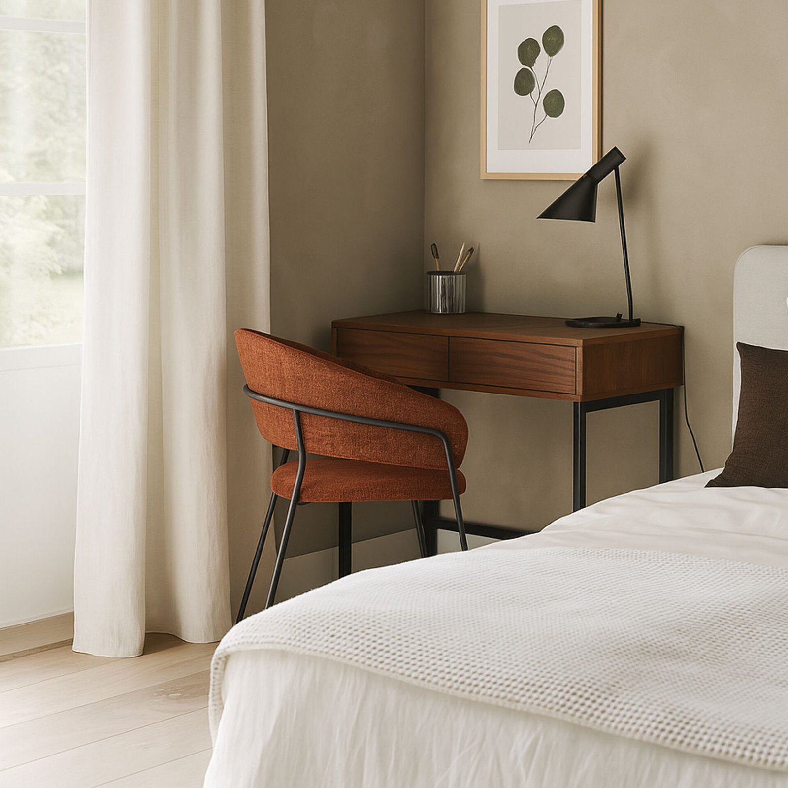 La struttura è in metallo verniciato nero opaco, con gambe sottili ma robuste che conferiscono leggerezza visiva pur mantenendo stabilità e resistenza.