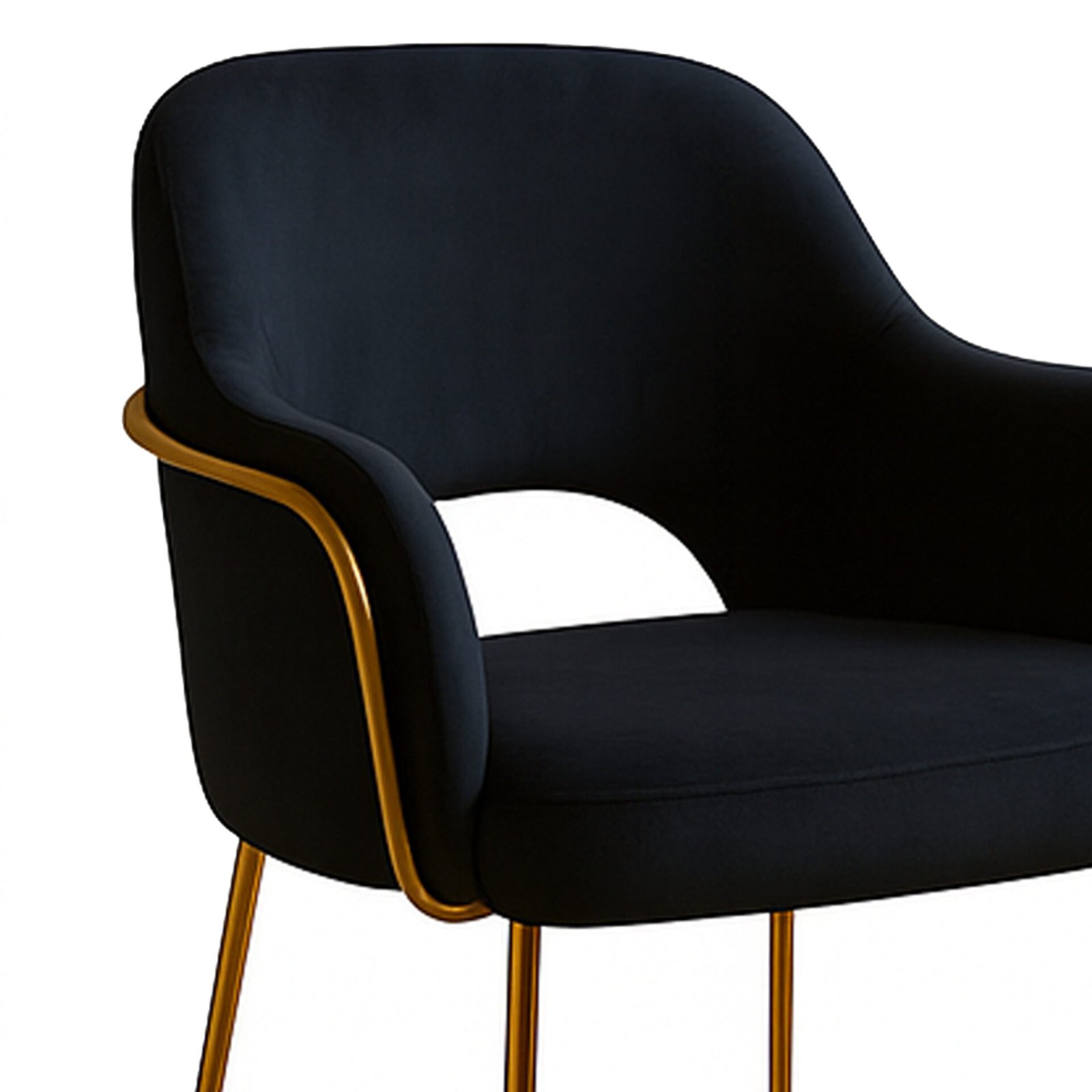 Schienale Avvolgente: Lo schienale imbottito, con una leggera curvatura nella parte superiore, assicura un buon supporto lombare e un comfort ottimale. Le gambe sottili e slanciate in metallo dorato creano un contrasto elegante con il velluto blu e aggiungono un tocco di raffinatezza.