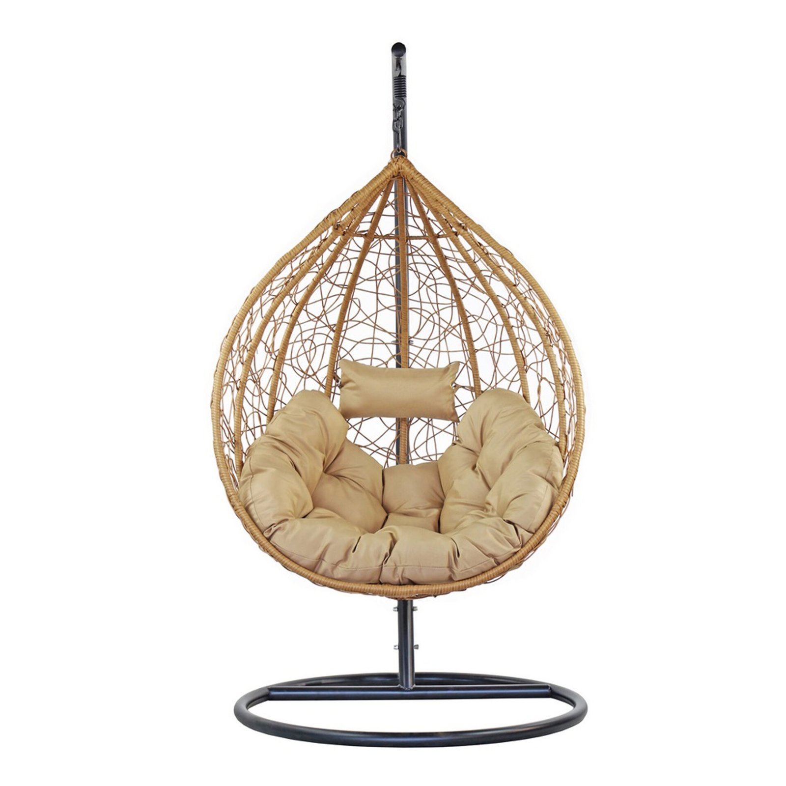 La poltrona sospesa da giardino, proposta nella raffinata, è un complemento d’arredo capace di coniugare stile, comodità e grande impatto visivo. Realizzata con una solida struttura in ferro, è composta da una base di 108 cm di diametro e da un supporto alto 198 cm, dal quale si sospende la poltrona a forma di uovo. Il corpo della seduta, in fibra sintetica intrecciata, è accompagnato da un set di cuscini in poliestere coordinati, che assicurano un comfort elevato e una morbidezza avvolgente.