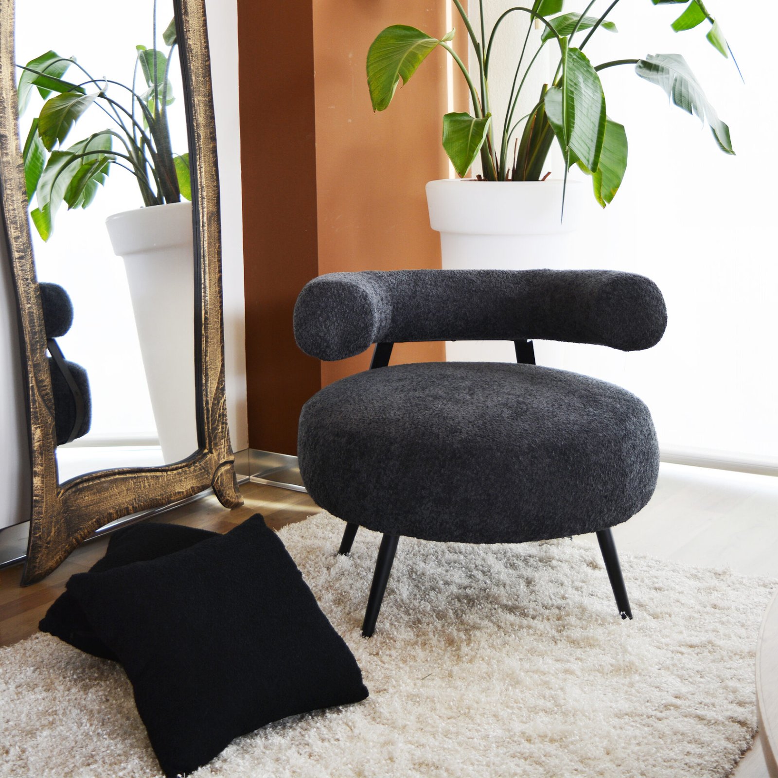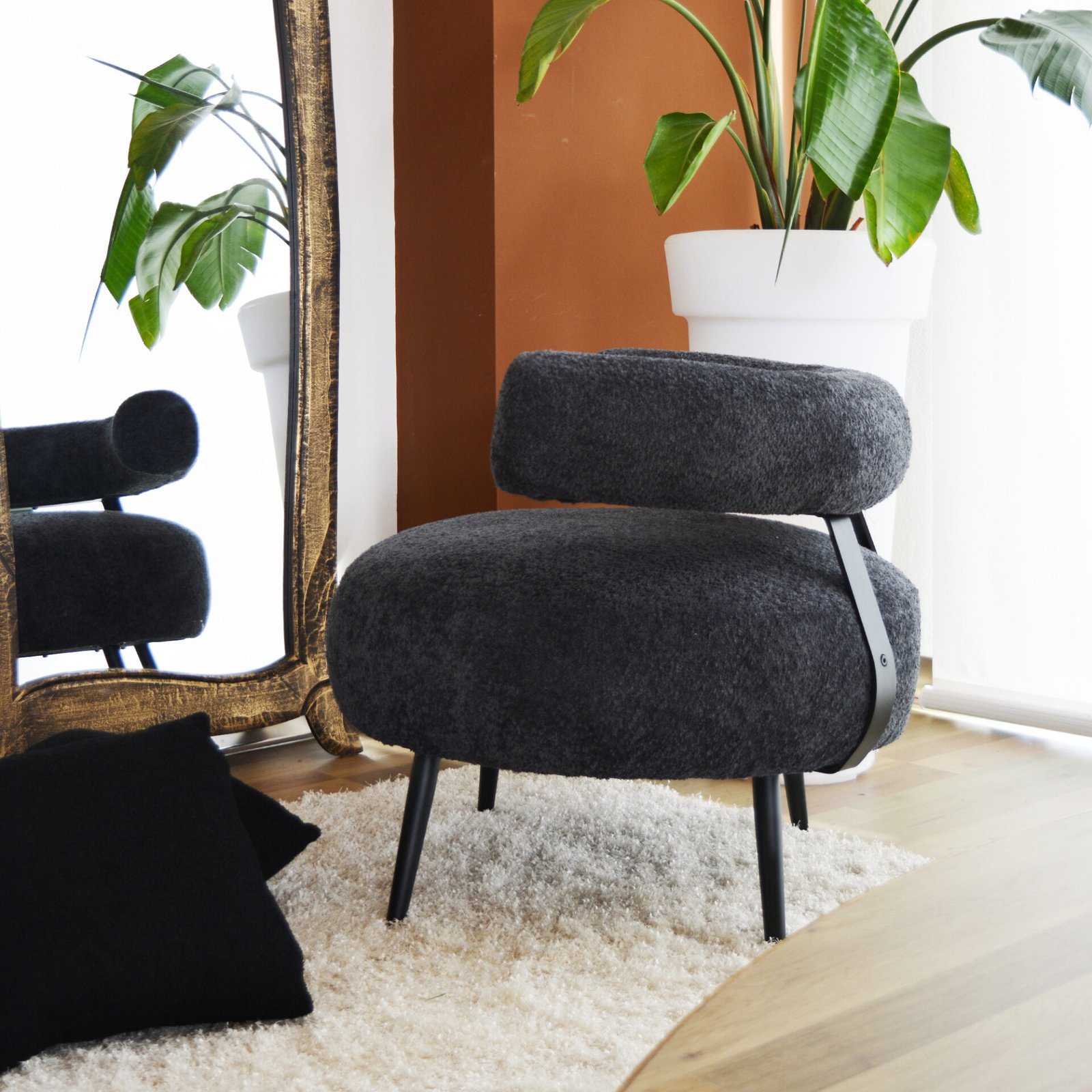 Elegante e unica, la poltrona Teddy è perfetta per living, soggiorni, stanze da letto, camerette o locali. Poltrona imbottita, rivestita in tessuto bouclè, struttura laccata nera. Una poltrona comoda, originale e bella