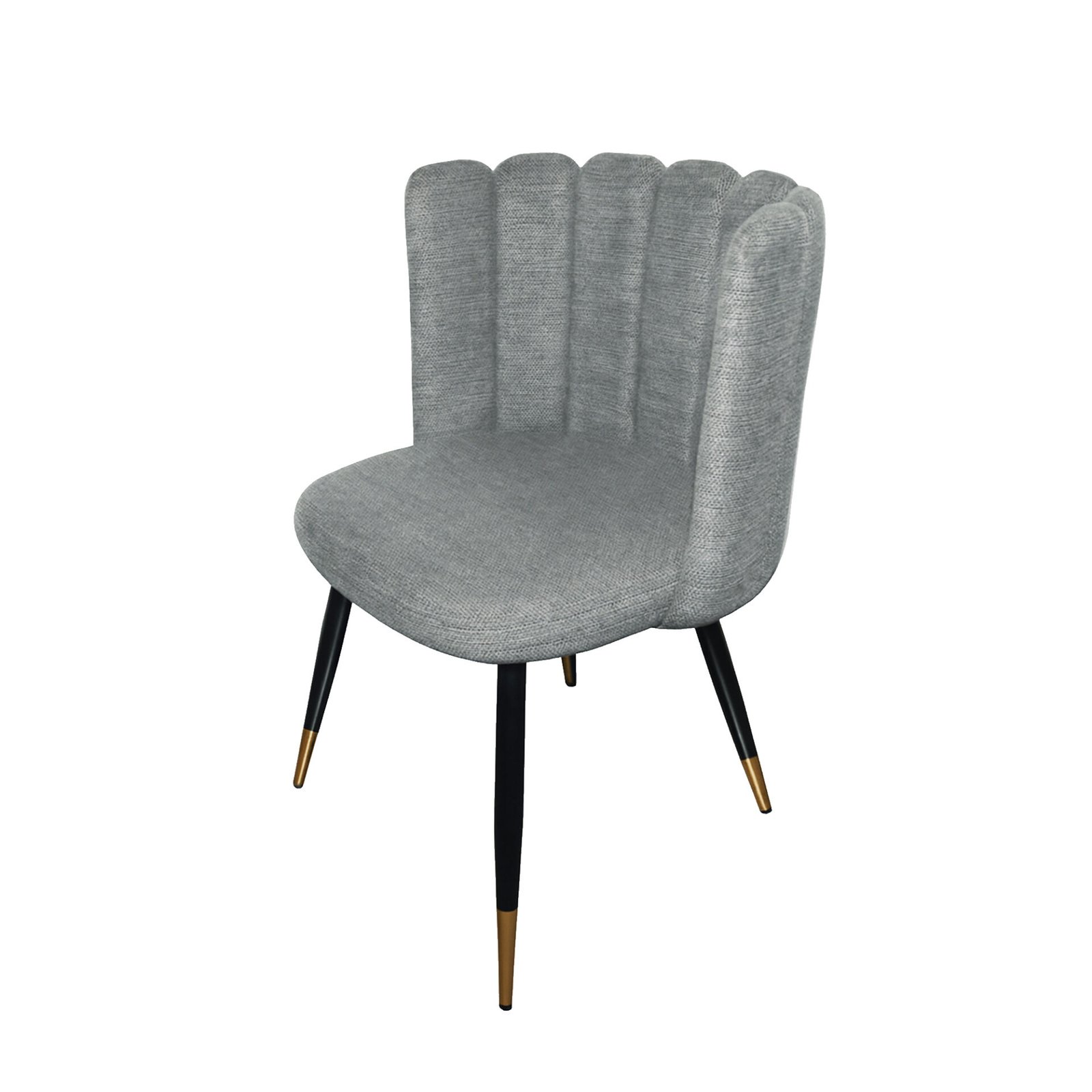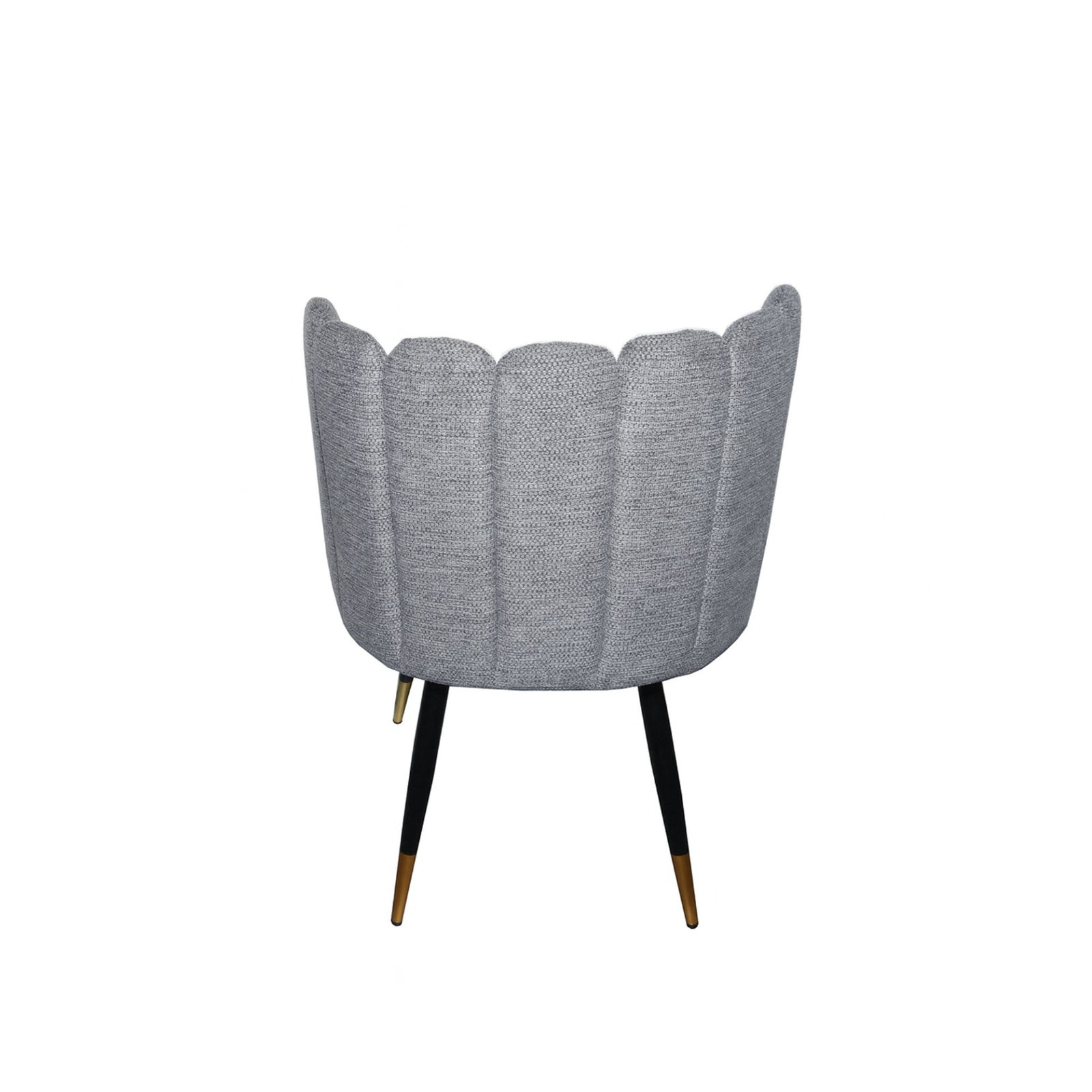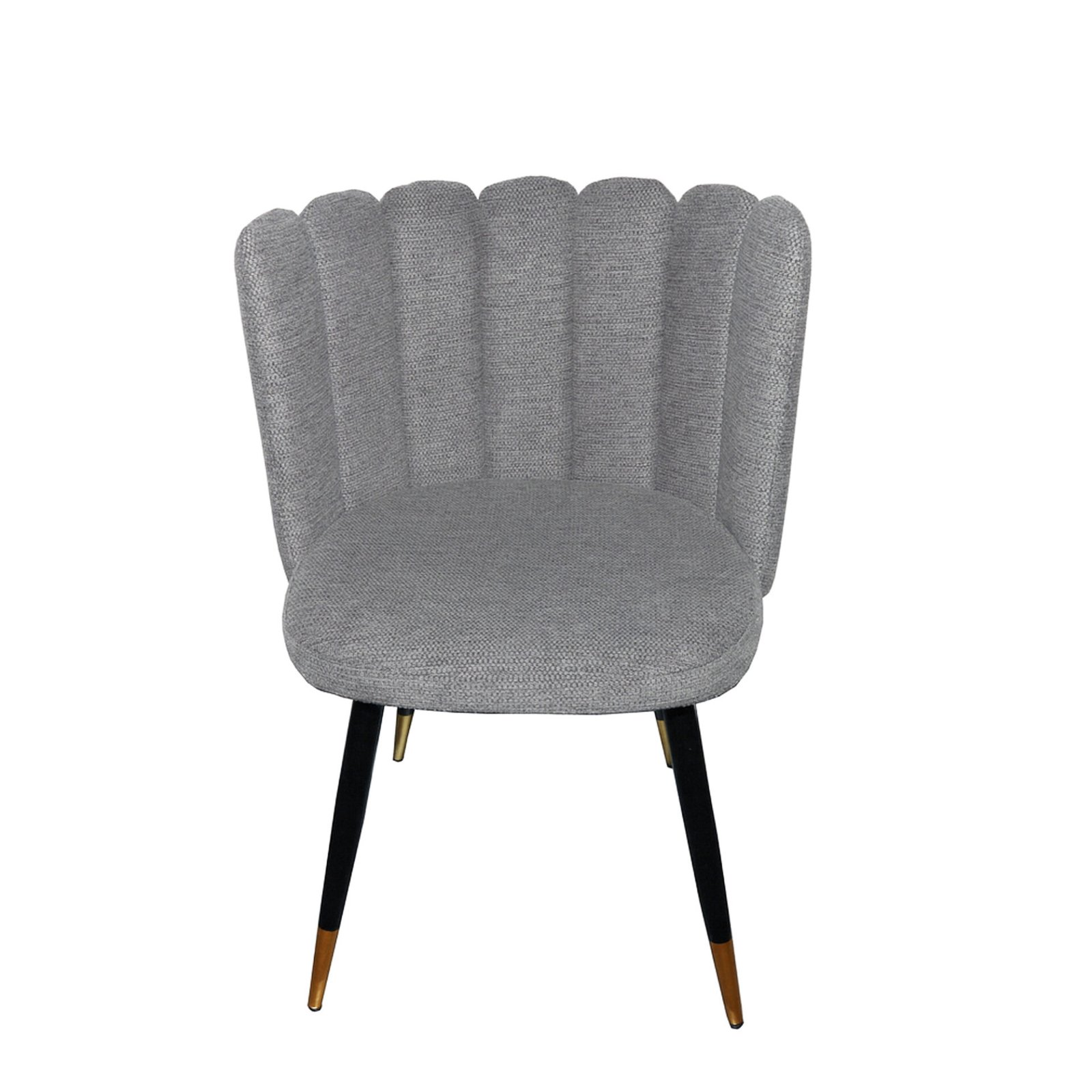 Poltroncina dal design elegante e moderno, caratterizzata da uno schienale avvolgente con pannelli verticali imbottiti che creano un effetto a conchiglia. La seduta è ampia e confortevole, con linee morbide e ben rifinite. Le gambe sono snelle e affusolate, in metallo, con puntali finali in finitura metallica che aggiungono un dettaglio ricercato. L’insieme trasmette uno stile raffinato e contemporaneo, perfetto per ambienti sofisticati.