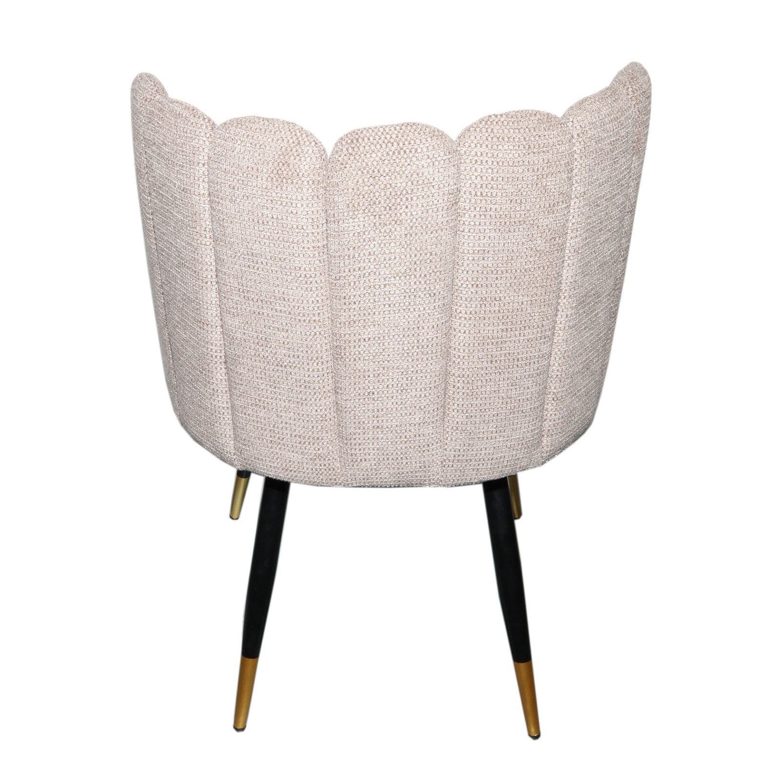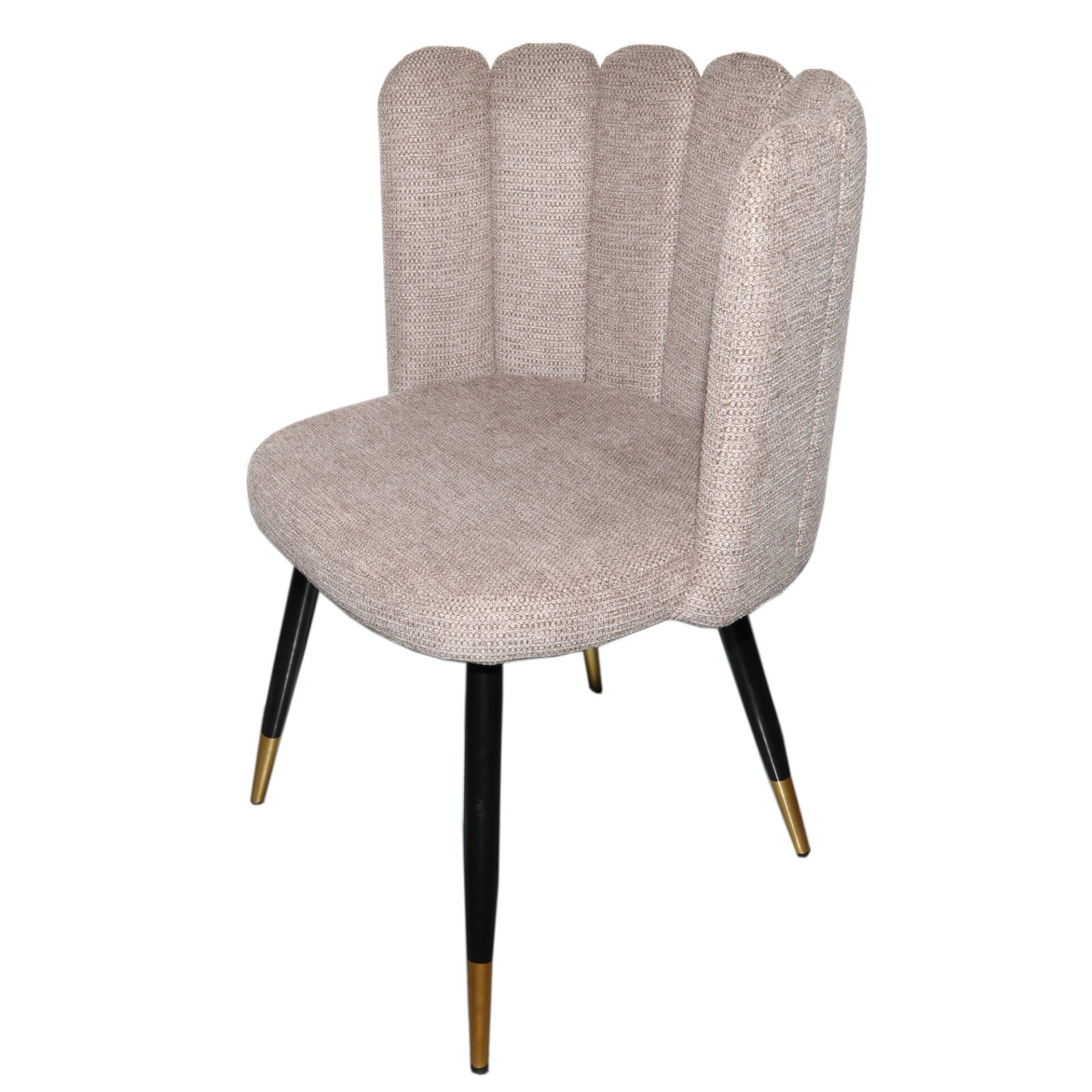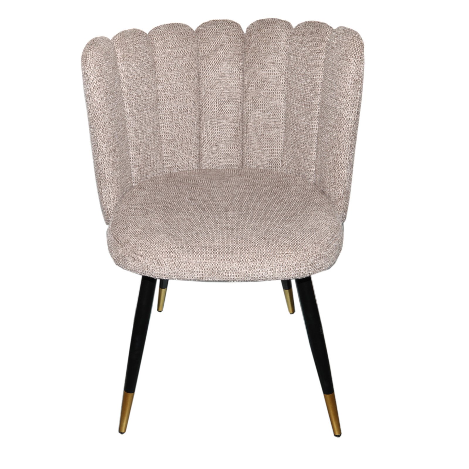 An armchair with an elegant and modern design, featuring an enveloping backrest with padded vertical panels that create a shell effect. The seat is wide and comfortable, with soft, well-finished lines. The slender, tapered metal legs feature metallic-finish tips that add a sophisticated touch. The overall design exudes a refined and contemporary style, perfect for sophisticated spaces.