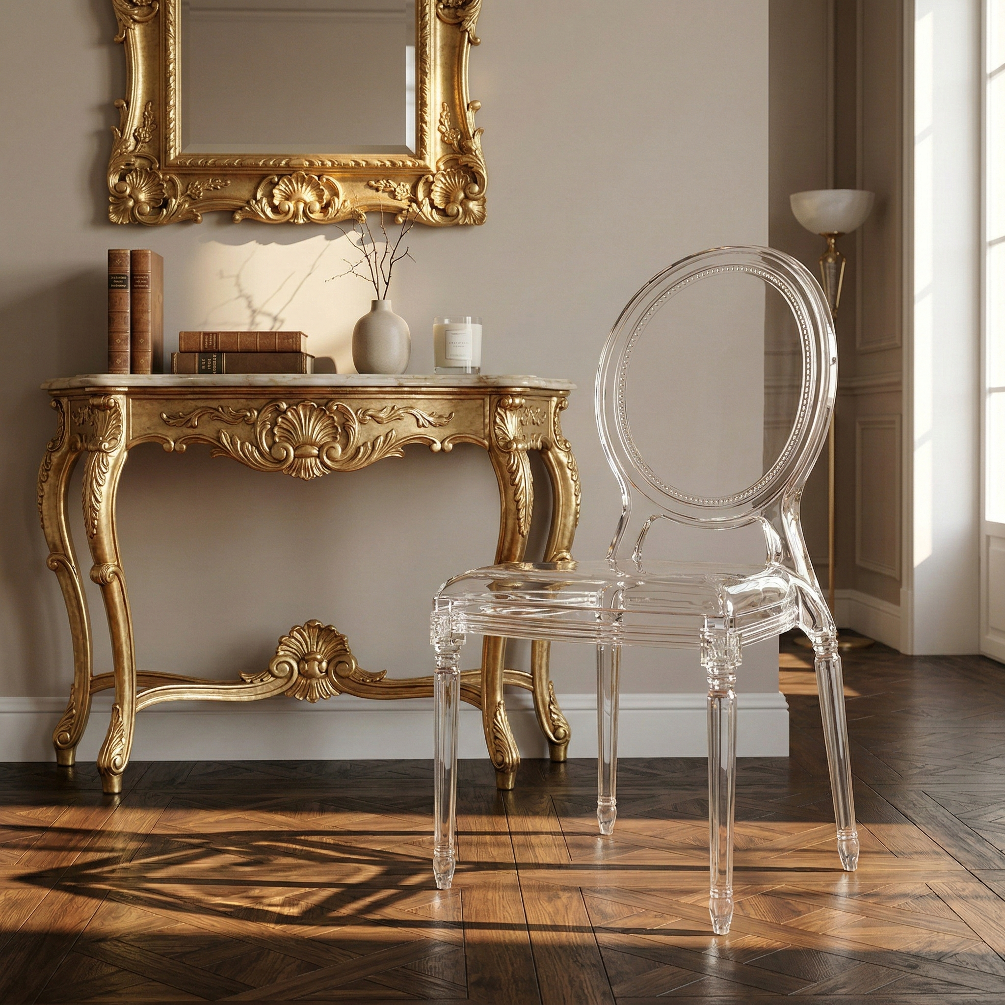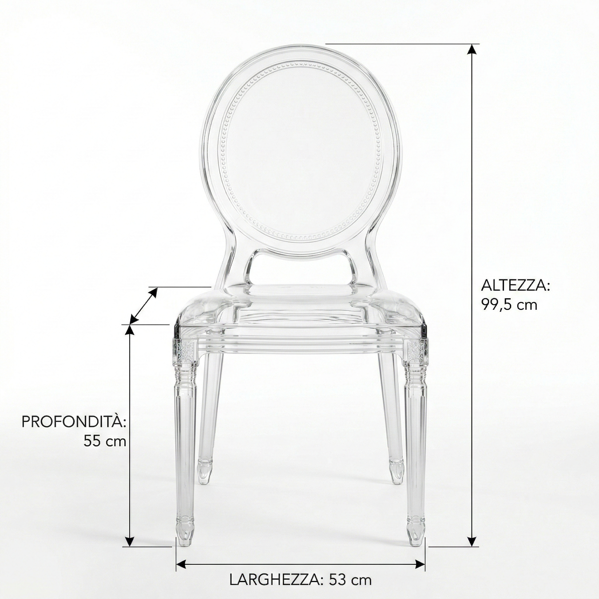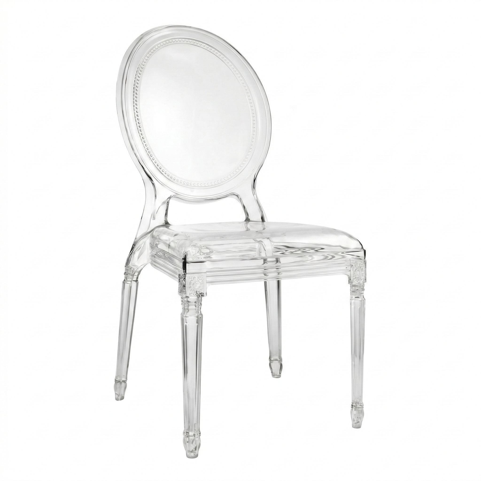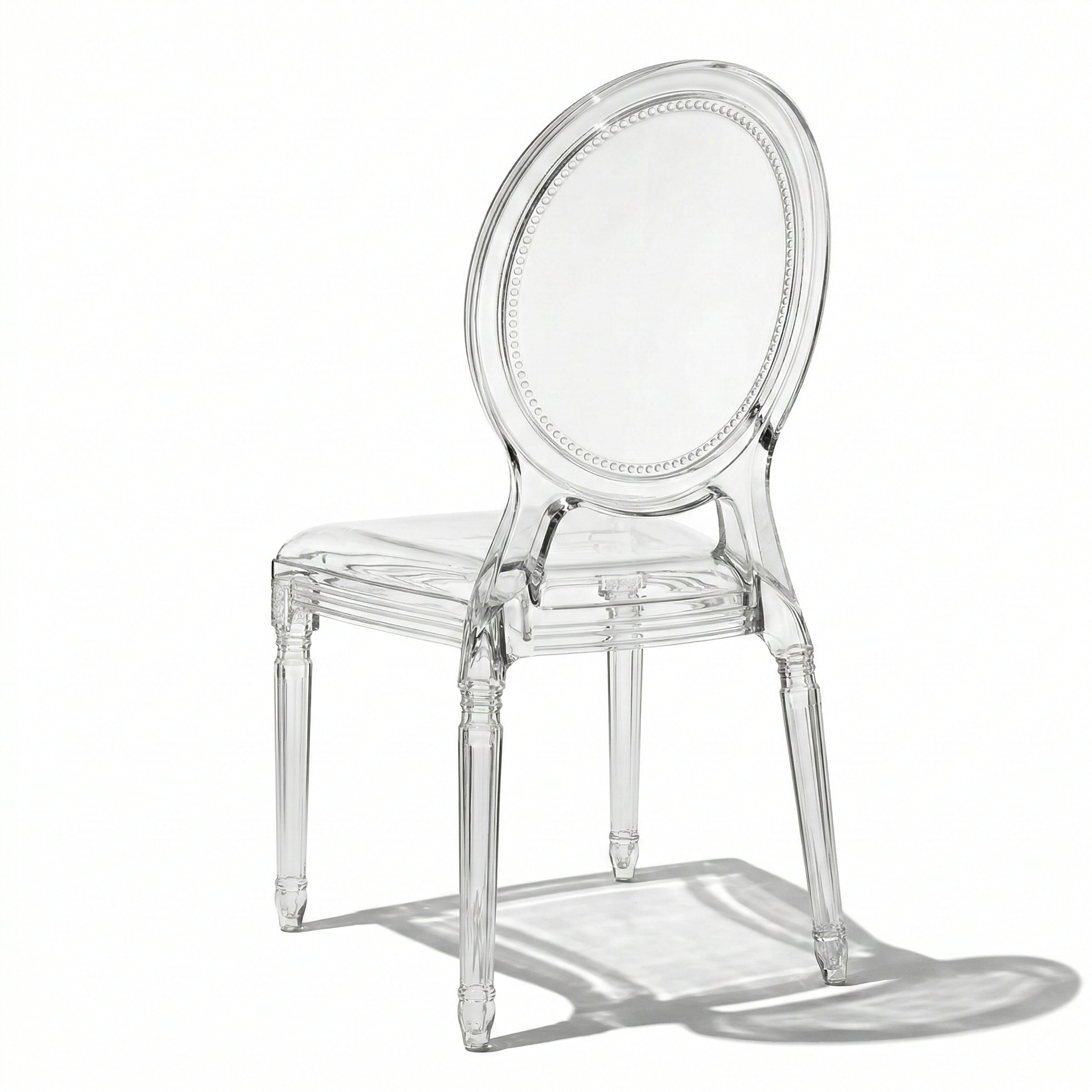 Transparent polycarbonate chair with an elegant and timeless design, inspired by classic style reinterpreted with a modern twist. The oval backrest, enhanced by a refined beaded motif along the profile, gives the chair a refined and light look, perfect for sophisticated and bright spaces. The wide, slightly rounded seat offers comfort and practicality, while the clean, harmonious lines maintain a balanced, versatile aesthetic suitable for both residential and contract settings.