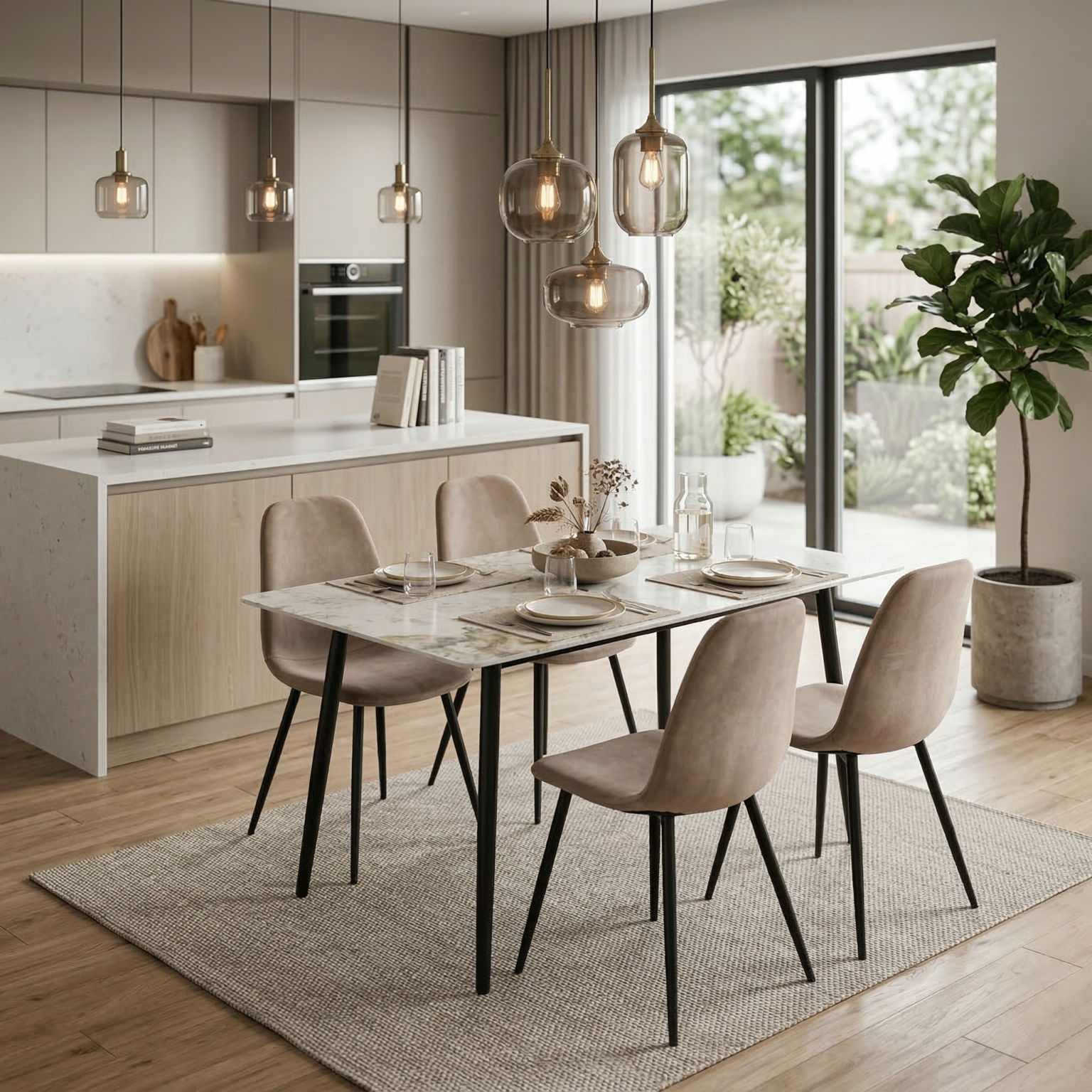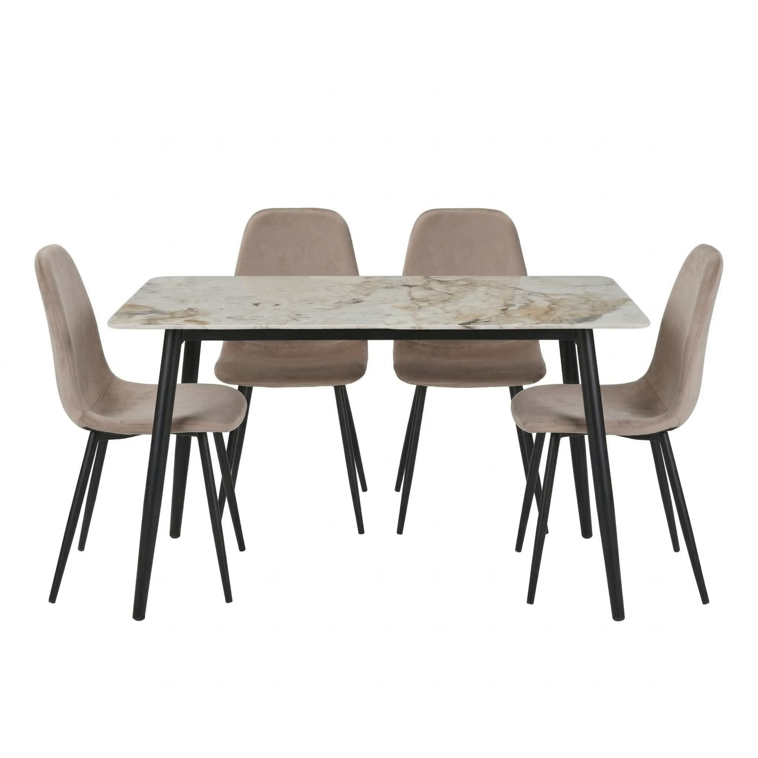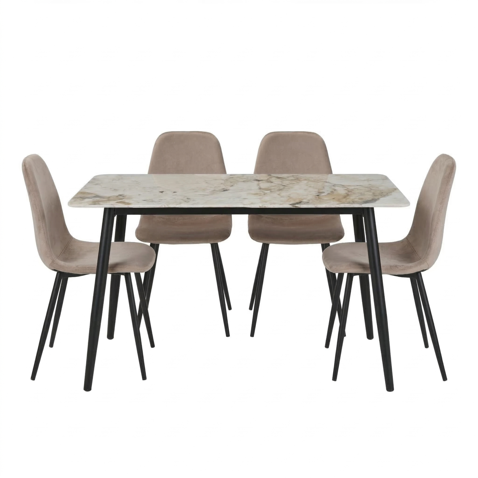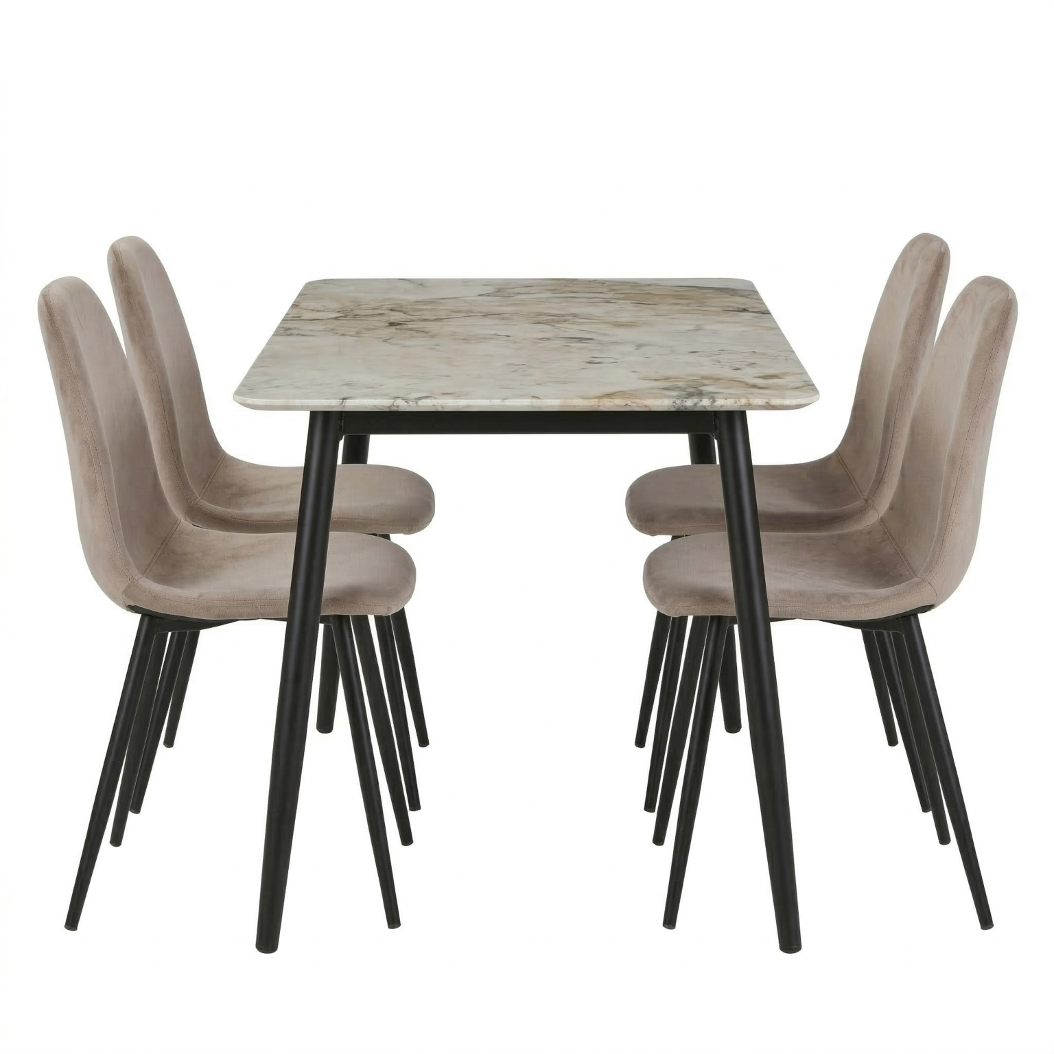 Set da pranzo dal design moderno ed elegante, perfetto per arredare con stile e comfort la zona living. Il tavolo, nella tonalità kashmir/beige con angoli stondati, è sorretto da quattro gambe nere robuste, combinando solidità ed estetica contemporanea. Le sedie sono rivestite in velluto morbido, con schienale avvolgente e seduta confortevole, poggiate su gambe in metallo nero che completano l’insieme con eleganza e stabilità. L’abbinamento di materiali e linee pulite rende questo set versatile e adatto a diversi stili d’arredo.