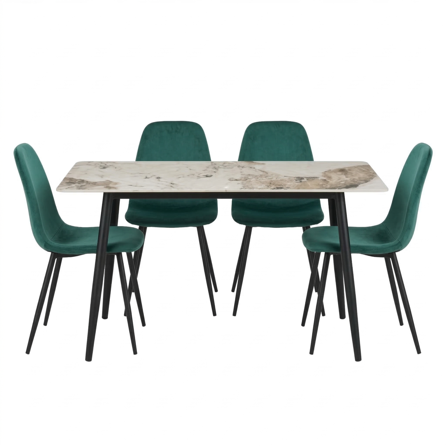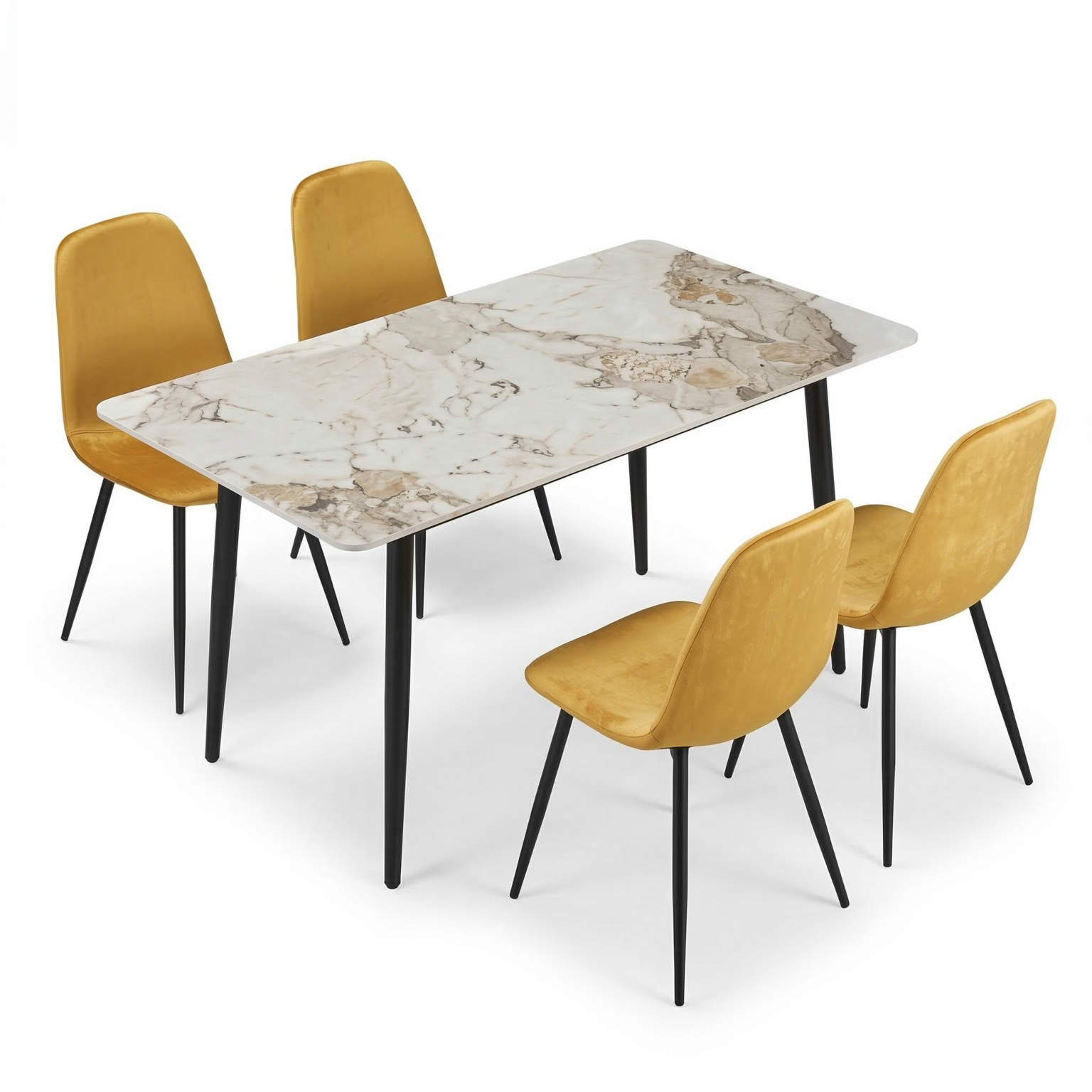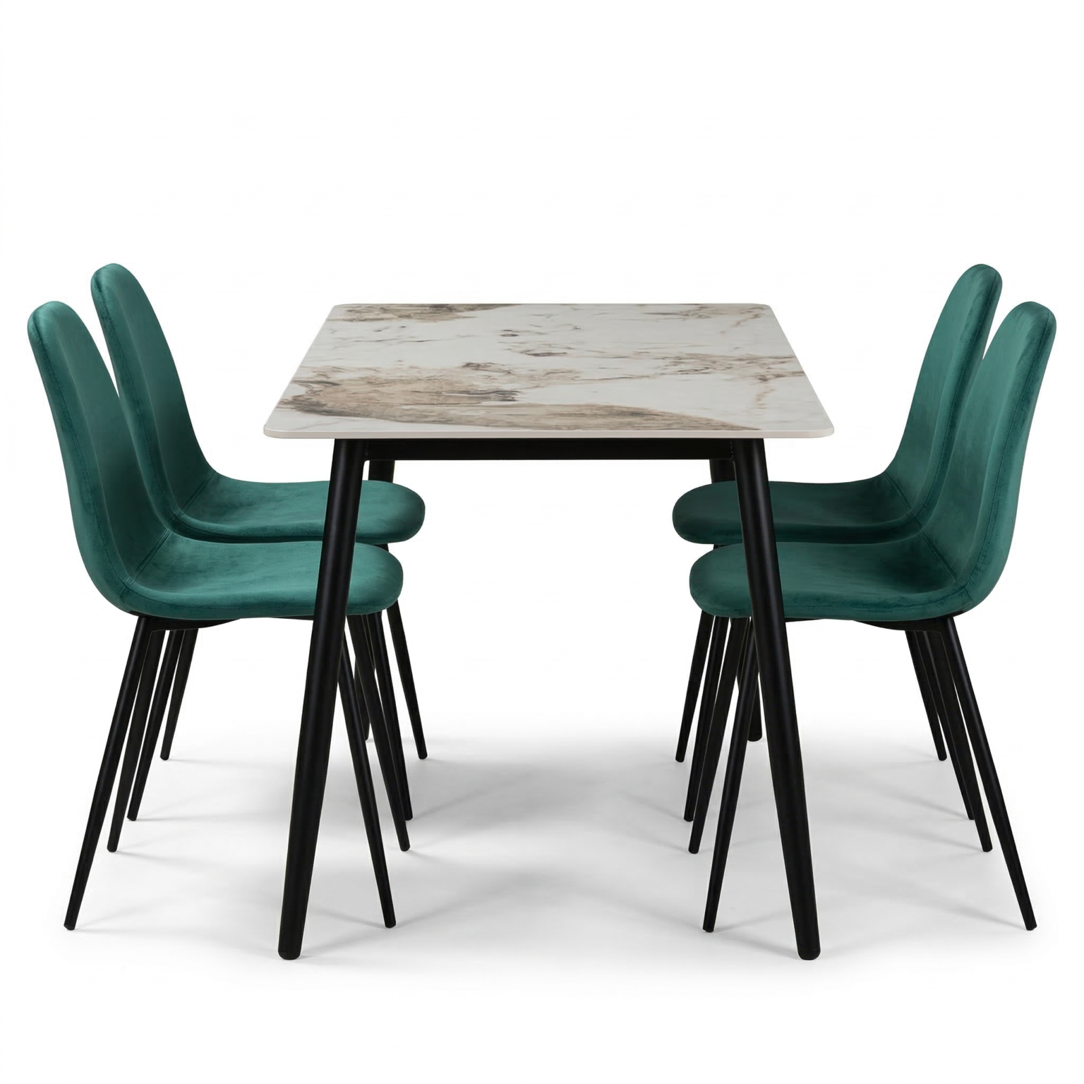 Set da pranzo dal design moderno ed elegante, perfetto per arredare con stile e comfort la zona living. Il tavolo, nella tonalità kashmir/beige con angoli stondati, è sorretto da quattro gambe nere robuste, combinando solidità ed estetica contemporanea. Le sedie sono rivestite in velluto morbido, con schienale avvolgente e seduta confortevole, poggiate su gambe in metallo nero che completano l’insieme con eleganza e stabilità. L’abbinamento di materiali e linee pulite rende questo set versatile e adatto a diversi stili d’arredo.