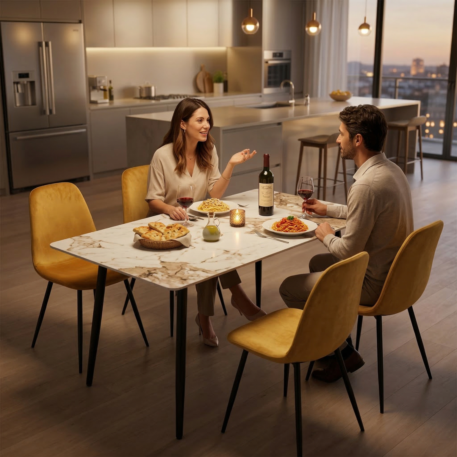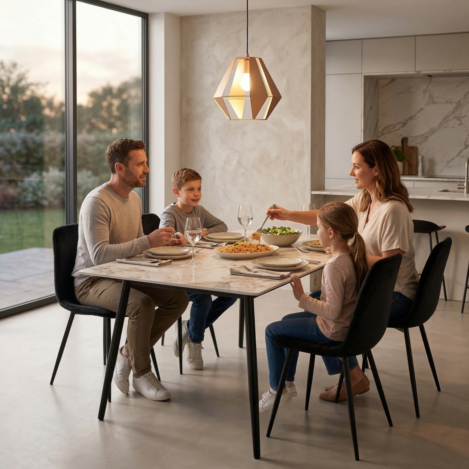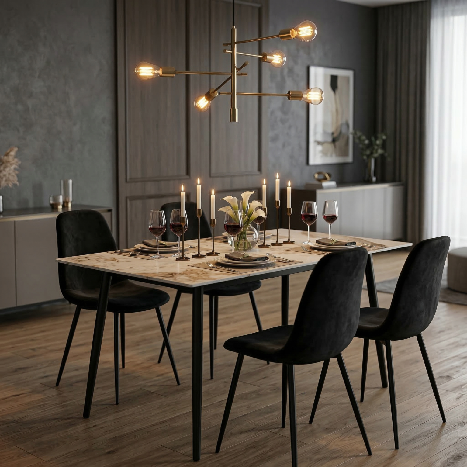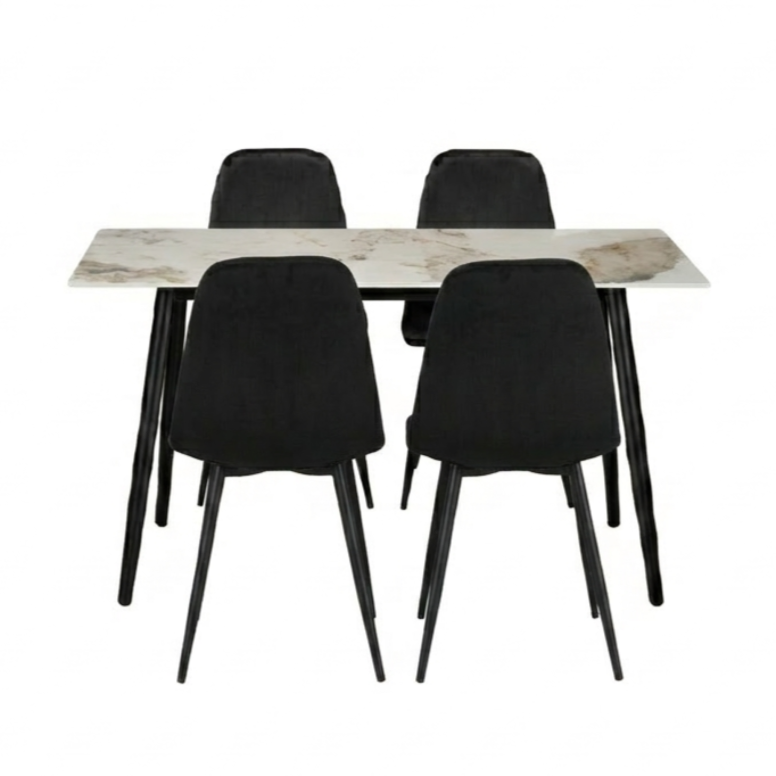 Set da pranzo dal design moderno ed elegante, perfetto per arredare con stile e comfort la zona living. Il tavolo, nella tonalità kashmir/beige con angoli stondati, è sorretto da quattro gambe nere robuste, combinando solidità ed estetica contemporanea. Le sedie sono rivestite in velluto morbido, con schienale avvolgente e seduta confortevole, poggiate su gambe in metallo nero che completano l’insieme con eleganza e stabilità. L’abbinamento di materiali e linee pulite rende questo set versatile e adatto a diversi stili d’arredo.