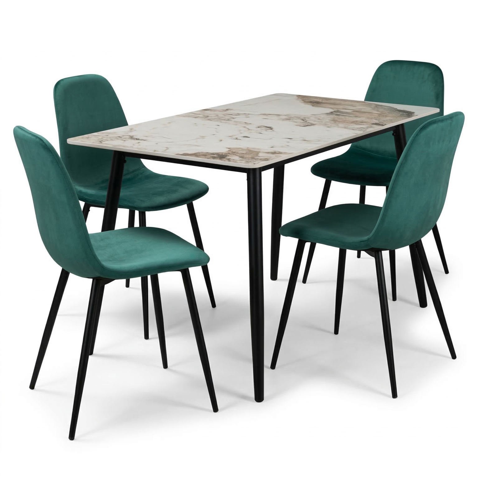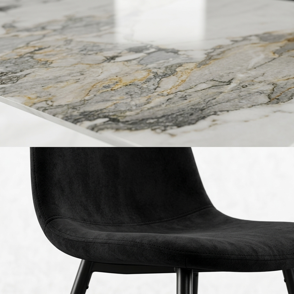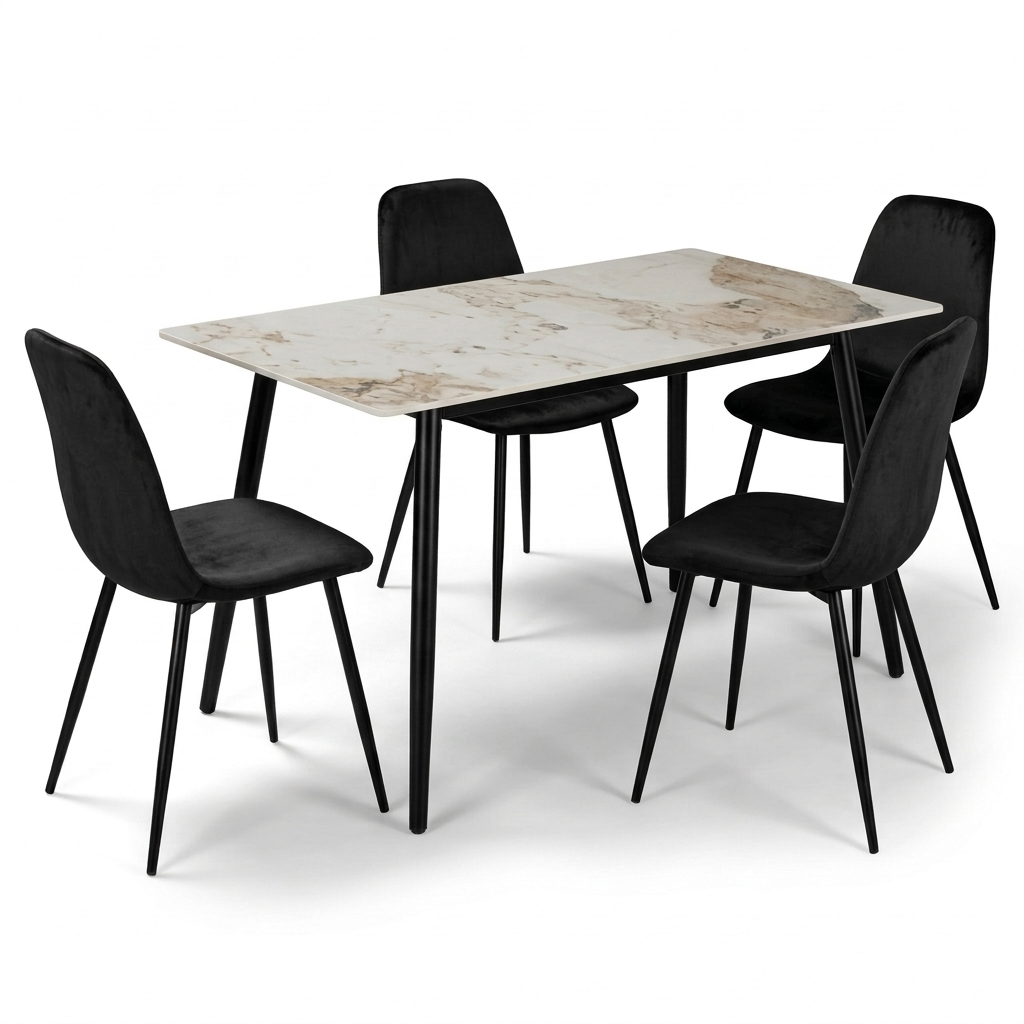 • Materiali: Tavolo in legno/piano laminato, sedie in velluto e metallo