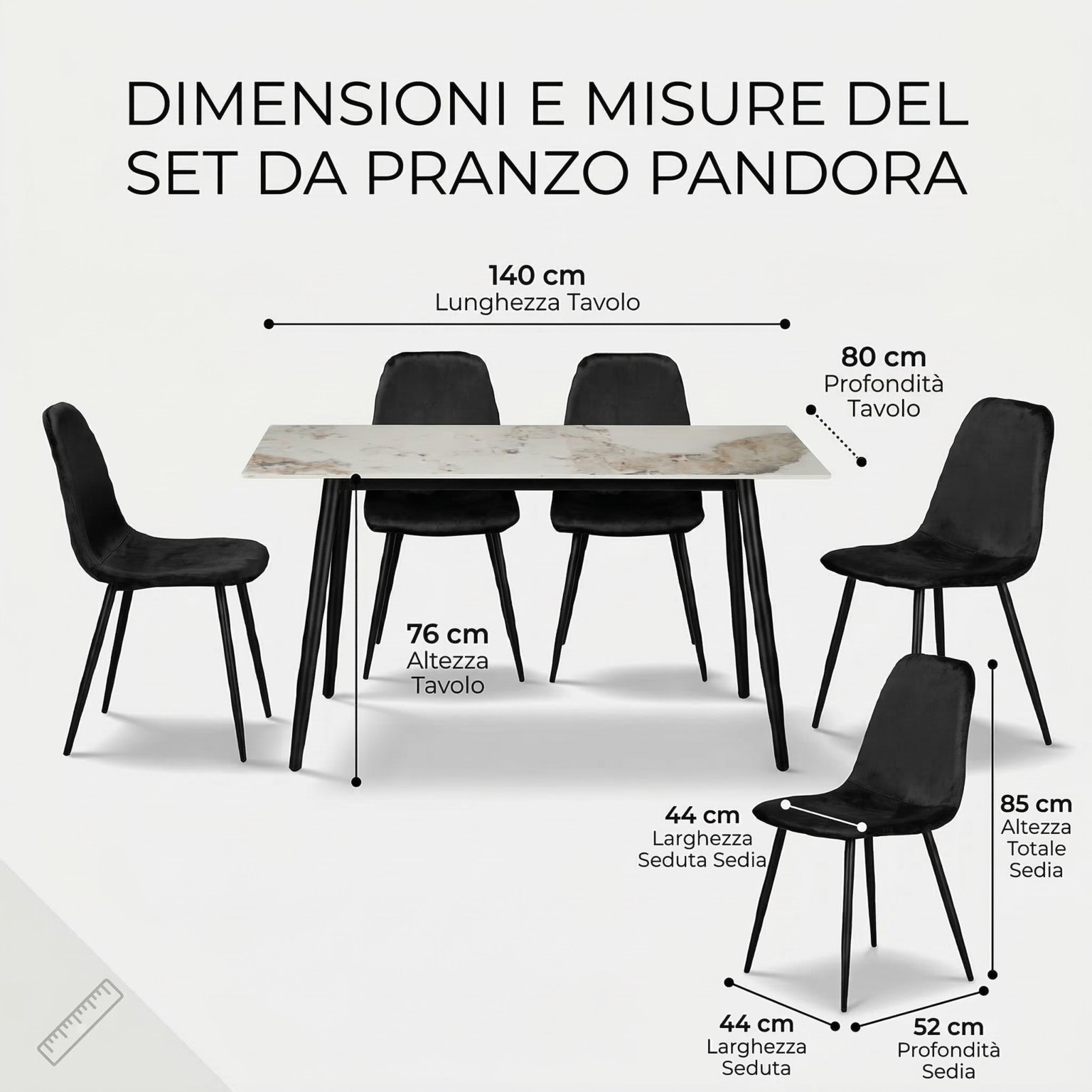 Opzioni disponibili: Piano Pandora / sedie nere | Piano Pandora / sedie verde | Piano Pandora / sedie senape | Piano Pandora / sedie tortora