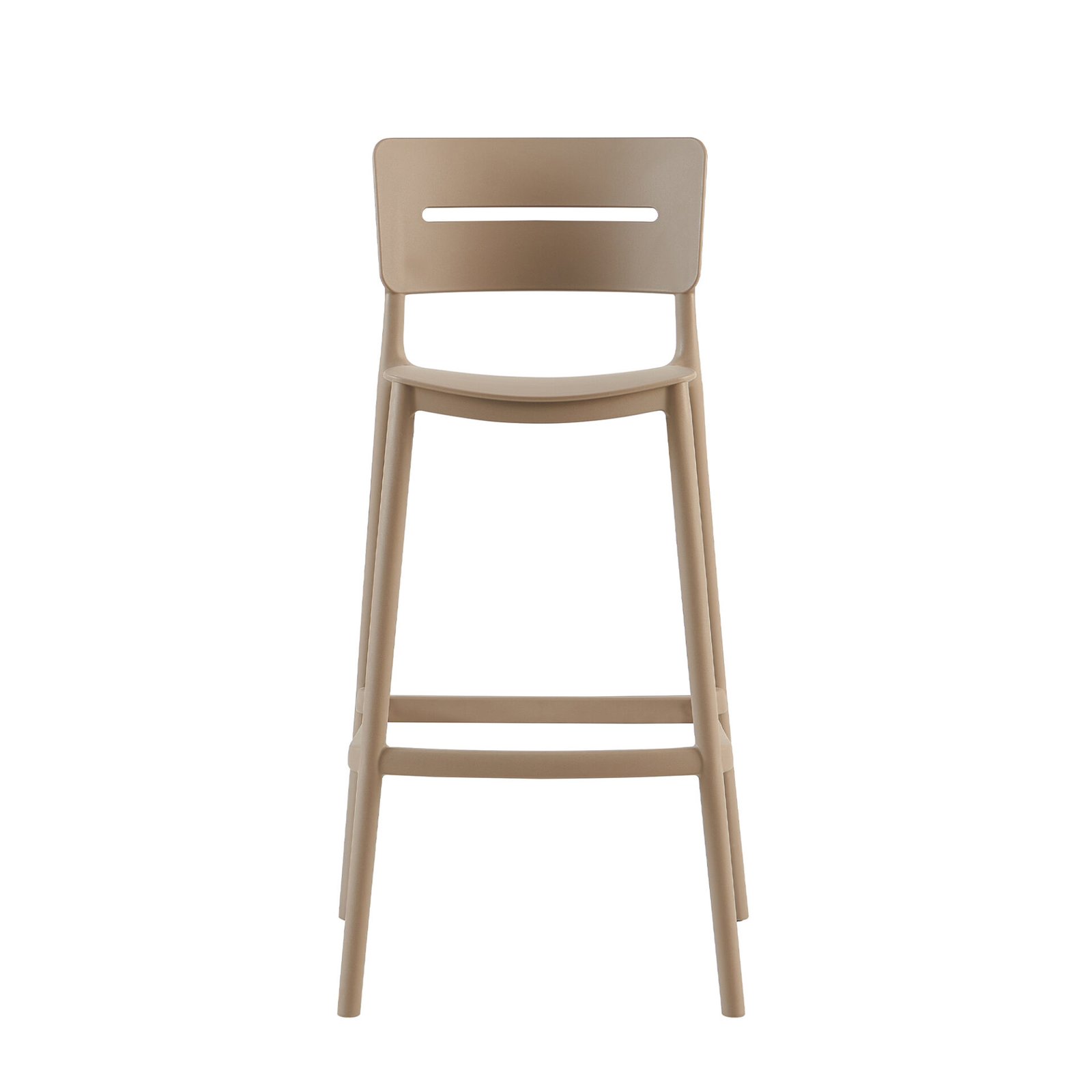 Lo sgabello presenta un design moderno e minimalista, caratterizzato da linee pulite e semplici. È realizzato interamente in polipropilene, un materiale leggero e resistente agli agenti atmosferici, ideale sia per interni che per esterni. La struttura dello sgabello è composta da quattro gambe sottili e affusolate che conferiscono un aspetto elegante e slanciato. La seduta e lo schienale sono realizzati in un unico pezzo di plastica, con un taglio orizzontale che alleggerisce la forma e aggiunge un tocco di originalità.
