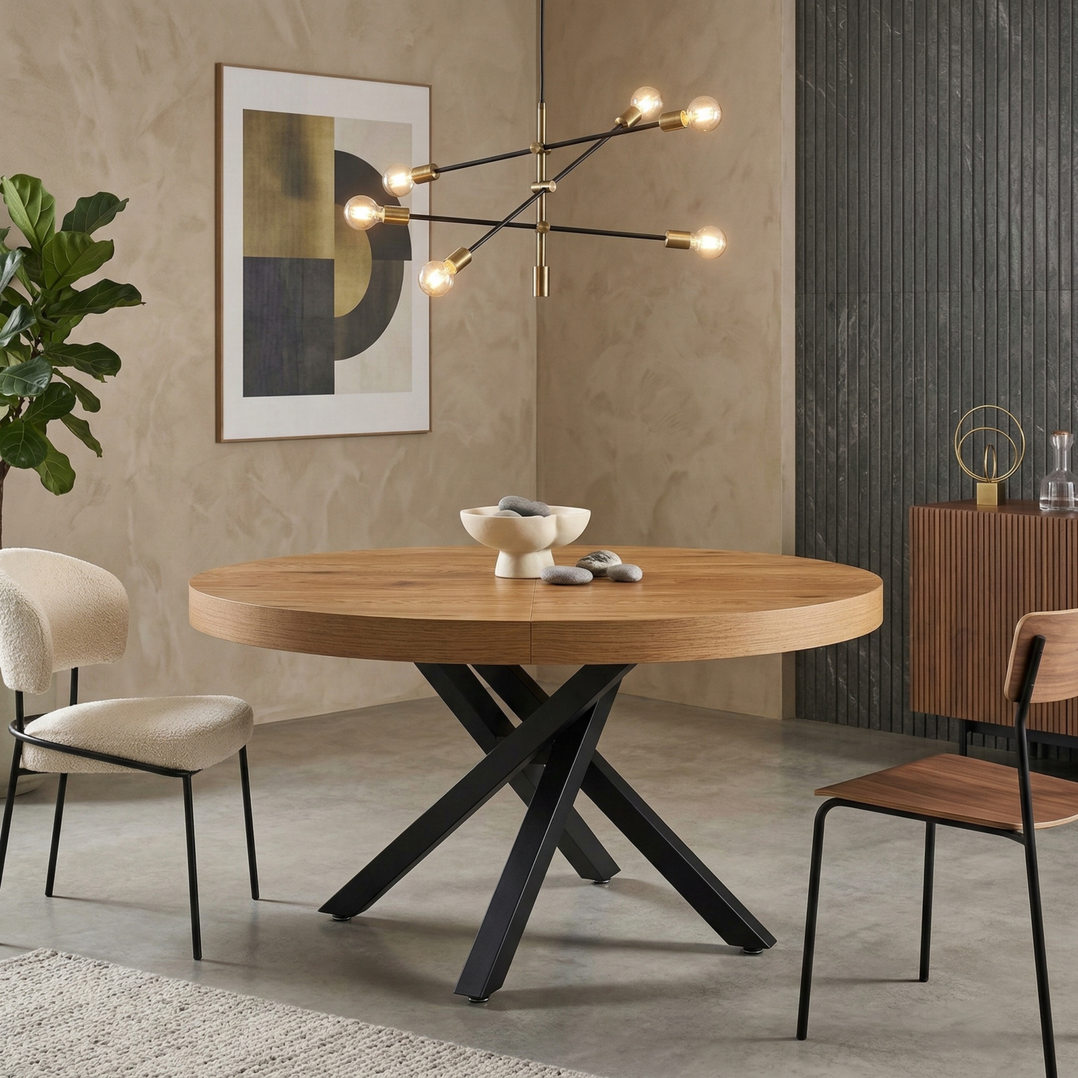 Extendable dining table with a contemporary design, ideal for those seeking practicality and style in a single solution. The round melamine top with a solid edge lends an elegant and harmonious look, perfect for tastefully furnishing the dining area. The central metal frame with crossed legs ensures high stability, solidity, and a striking aesthetic. Thanks to its extendable feature, the table is easily adapted for both everyday use and convivial gatherings with several guests.