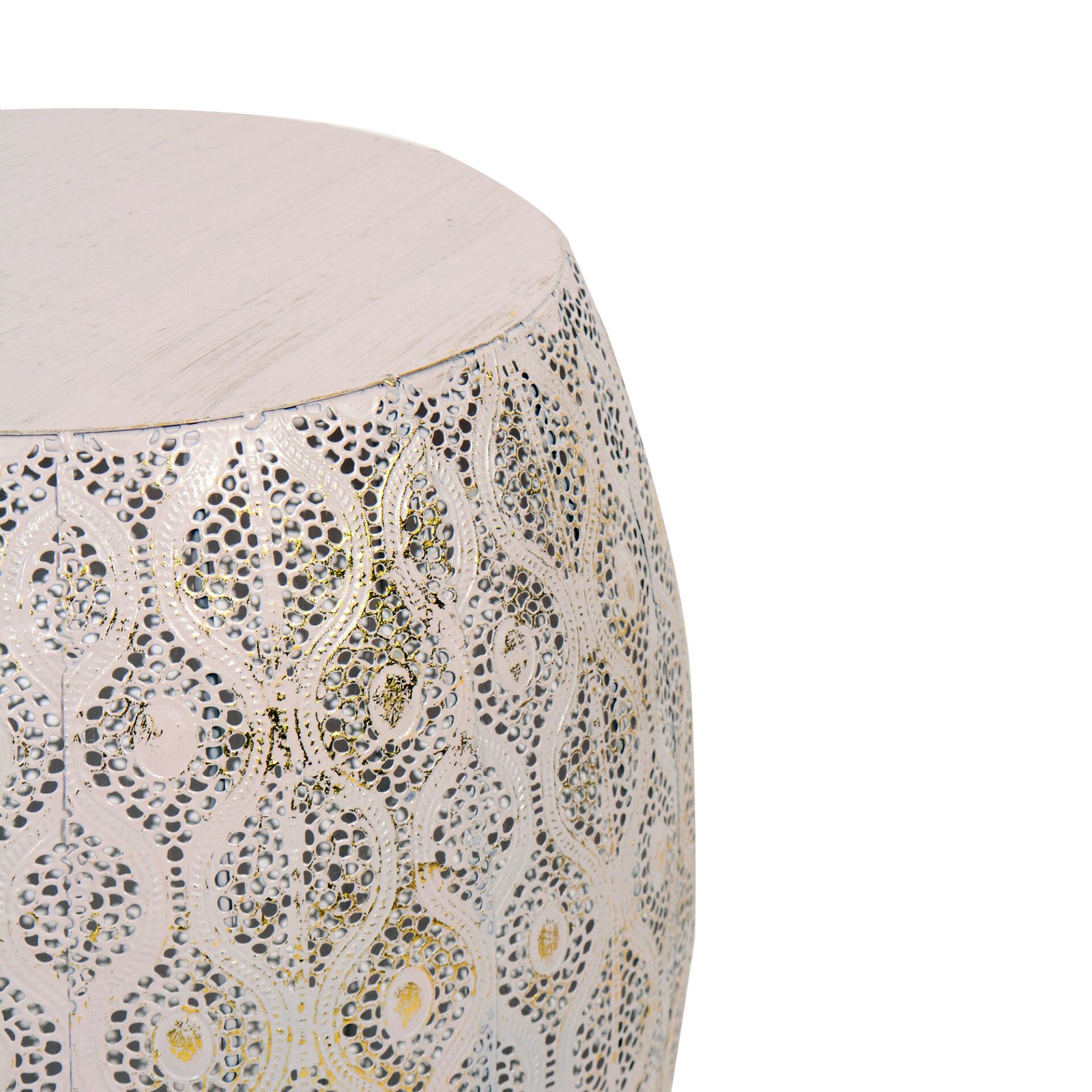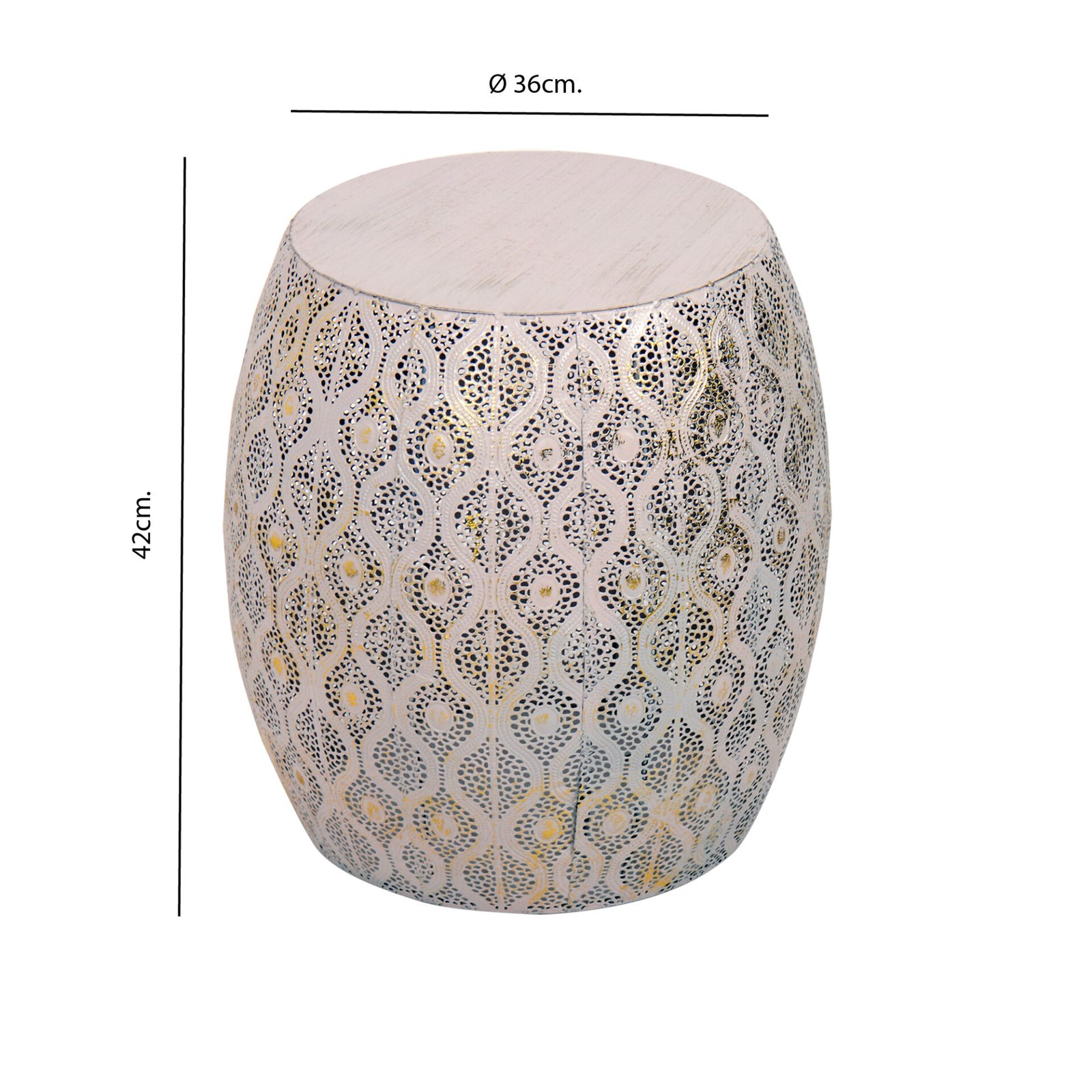 Grazioso, pratico e particolare, il tavolino Pouf è perfetto accanto a un divano, in un living, ma anche accanto al letto. Realizzato in metallo, si presenta come un cilindro più ampio al centro, il perimetro del tavolino è intarsiato da disegni dal sapore orientale. Pouf è reso particolare anche dal colore, un rosa tenue con sfumature dorate.