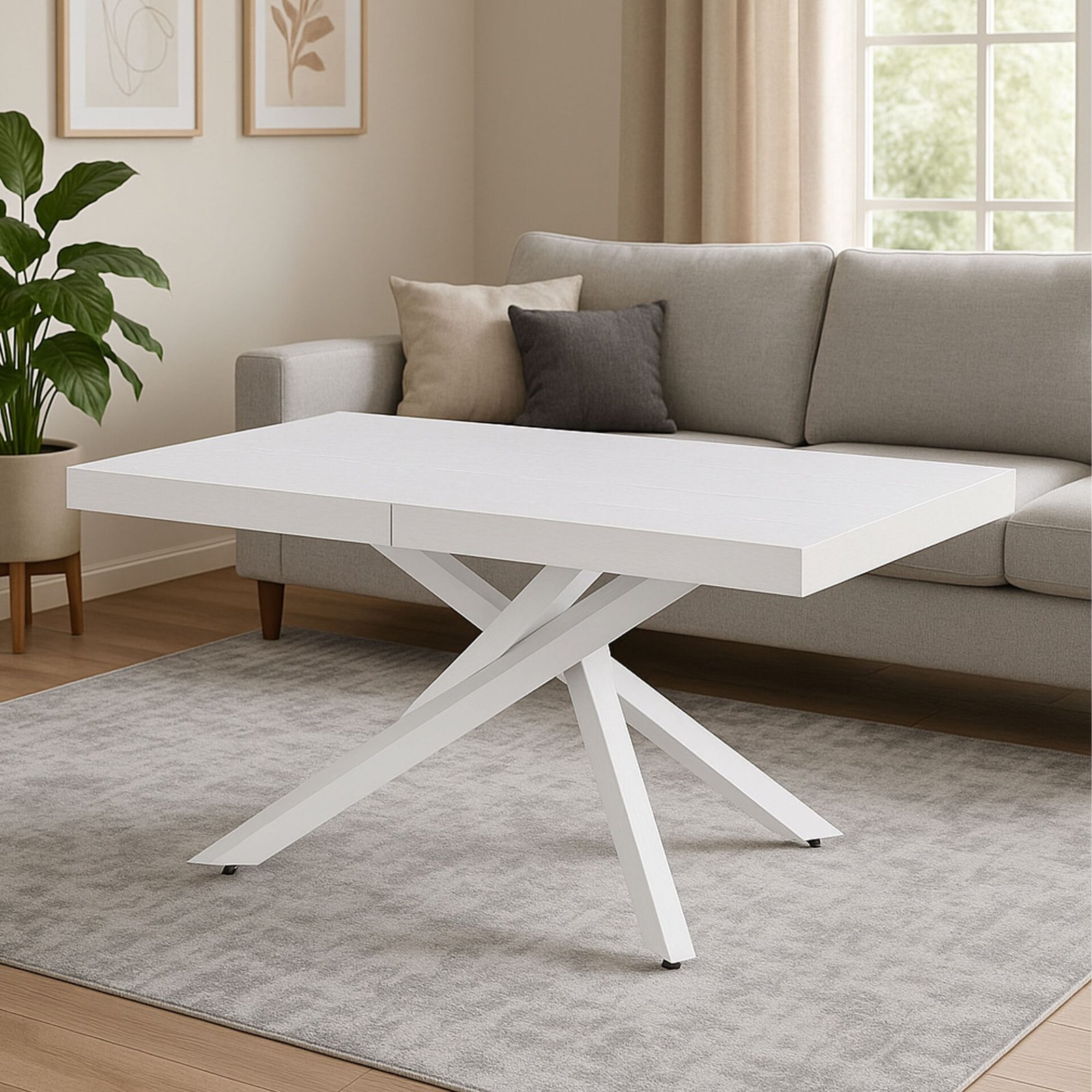 Il tavolo è un’elegante soluzione d’arredo caratterizzata da un design allungabile. Il piano del tavolo è bianco, conferendo al mobile un aspetto naturale e caldo. Le gambe, di colore bianco, sono posizionate ad incrocio centrali, aggiungendo un elemento di interesse visivo al design complessivo.