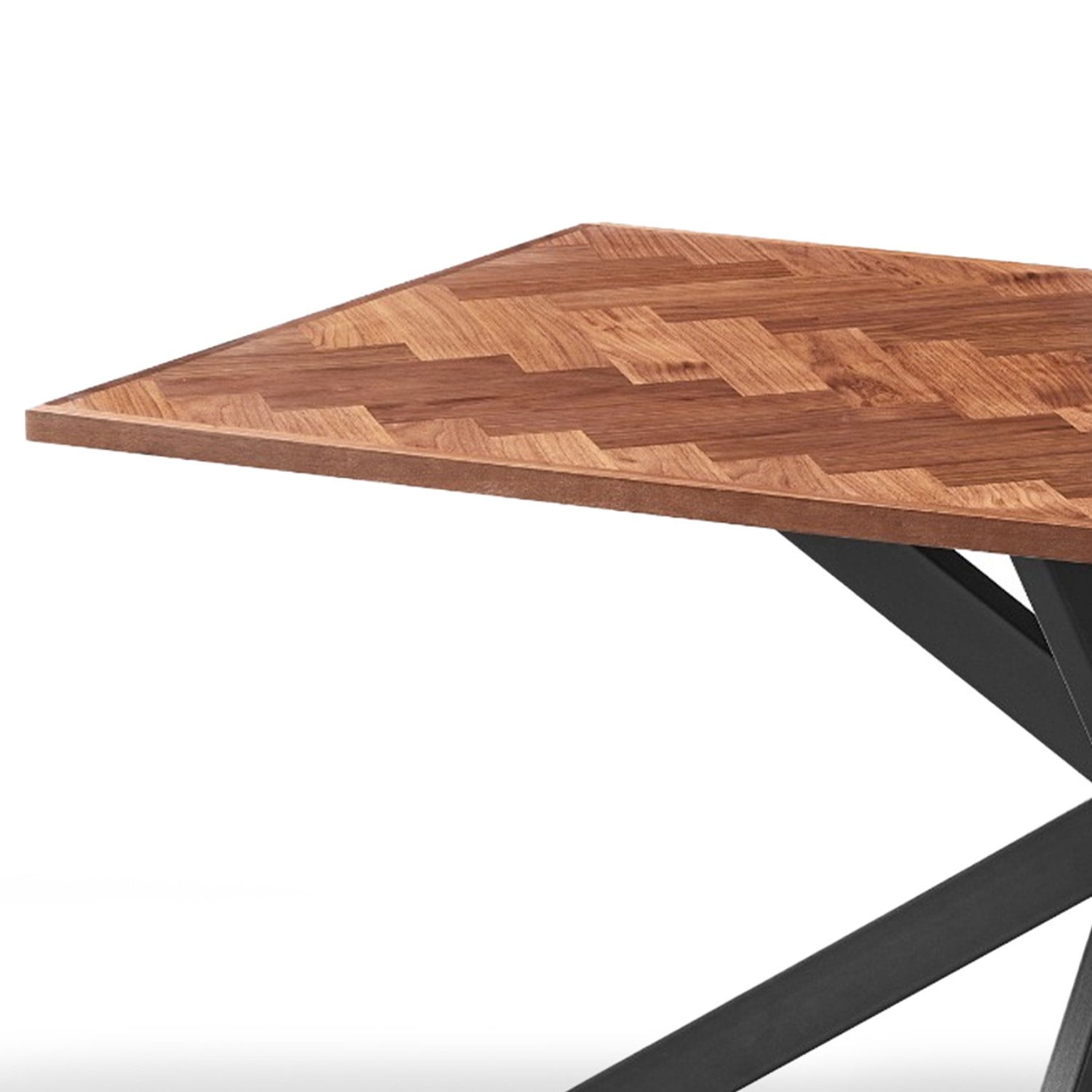 Tavolo rettangolare fisso con piano rovere scuro intarsiato, gambe in metallo laccate nere ad incrocio