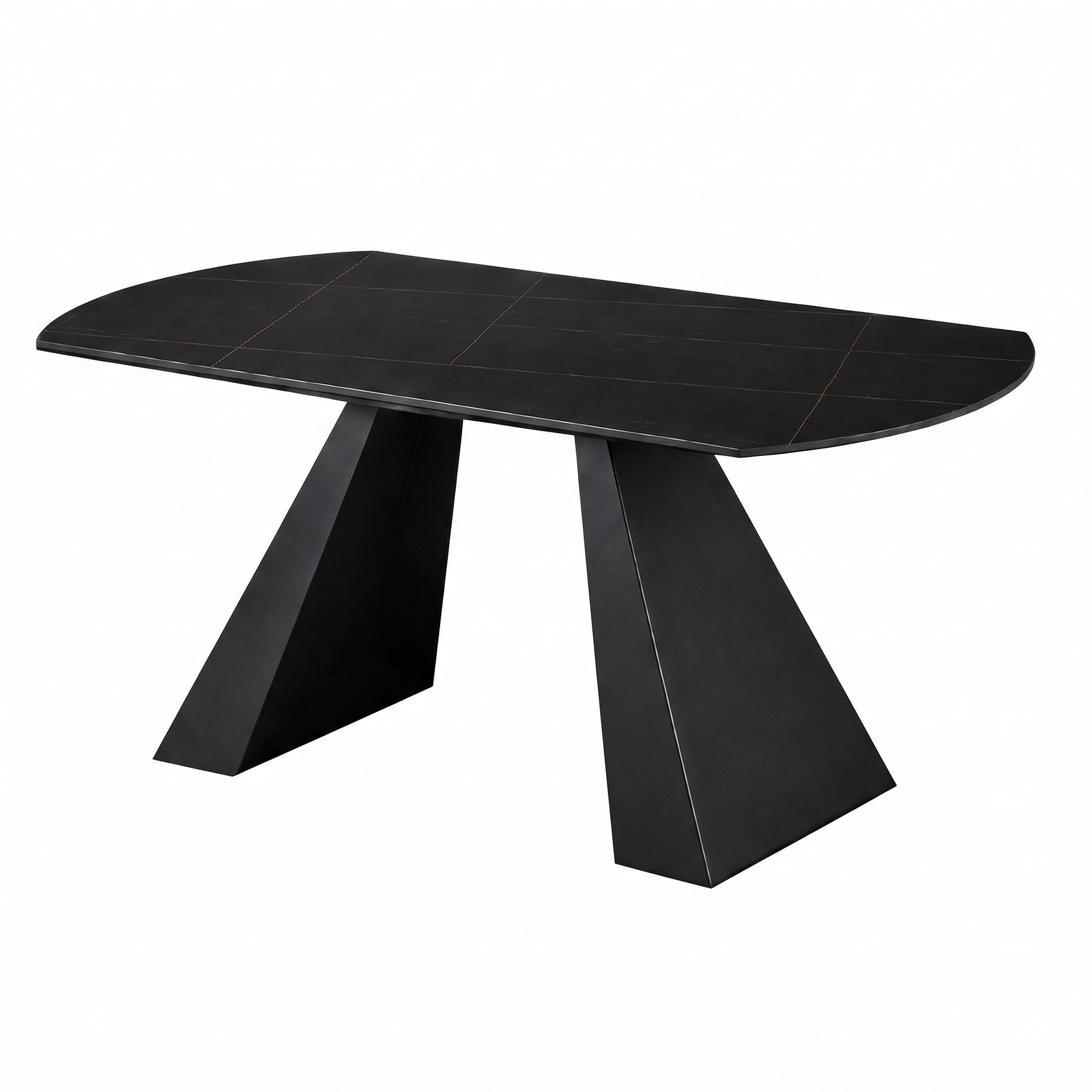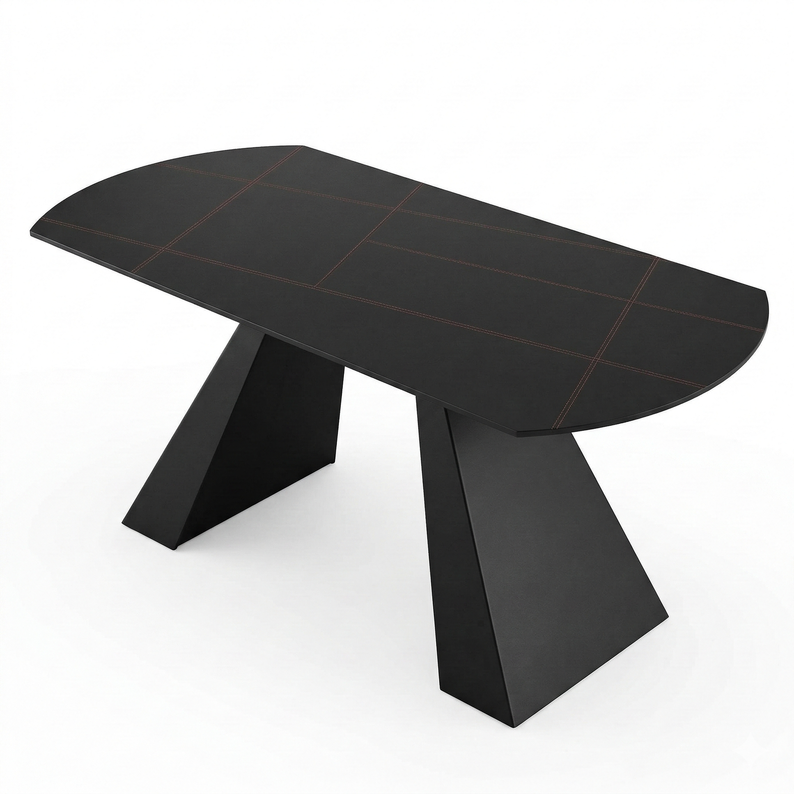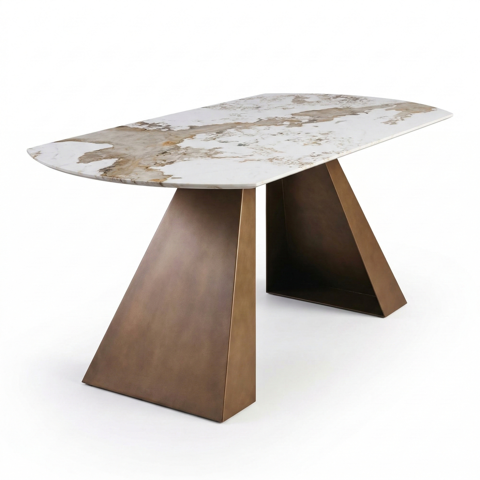 A table with a contemporary and elegant design, designed to stylishly enhance the dining area. The softly curved top with rounded edges creates visual harmony and a refined look, creating a seamless and modern surface. The frame is composed of two central bases with a slanted and sculptural design, lending solidity, stability, and a strong aesthetic without weighing down the overall effect. Ideal for modern spaces, this table combines functionality and sophistication in a single furnishing solution.