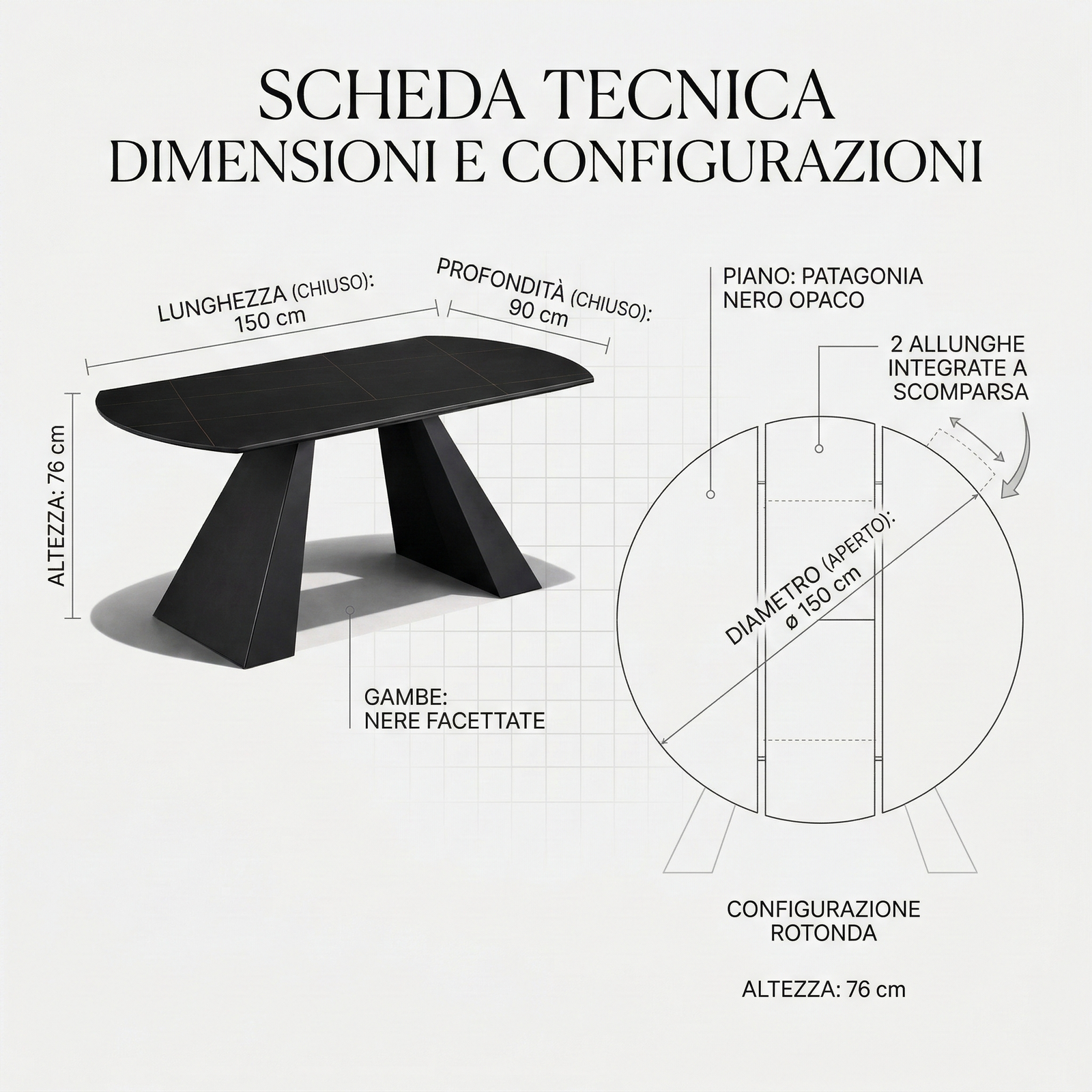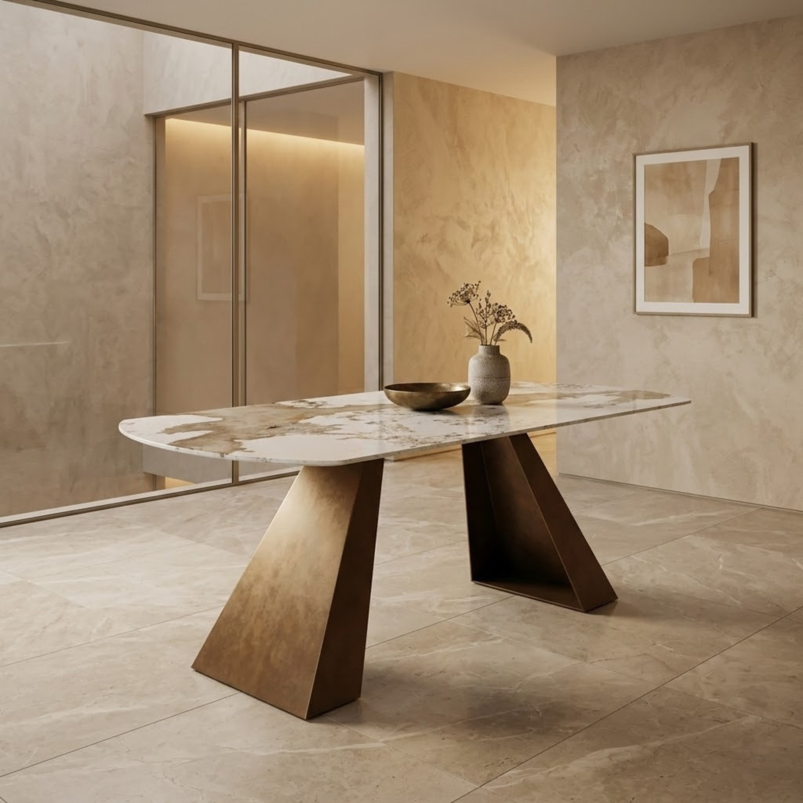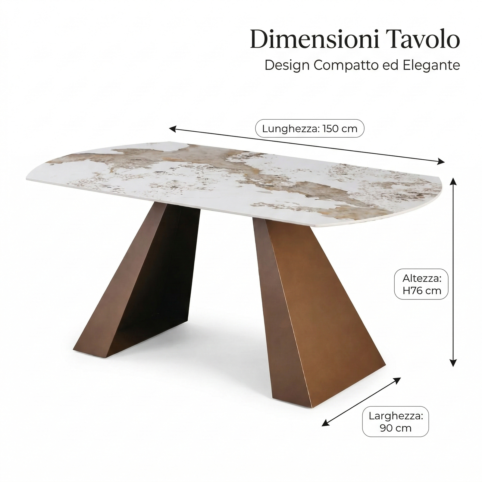 A table with a contemporary and elegant design, designed to stylishly enhance the dining area. The softly curved top with rounded edges creates visual harmony and a refined look, creating a seamless and modern surface. The frame is composed of two central bases with a slanted and sculptural design, lending solidity, stability, and a strong aesthetic without weighing down the overall effect. Ideal for modern spaces, this table combines functionality and sophistication in a single furnishing solution.