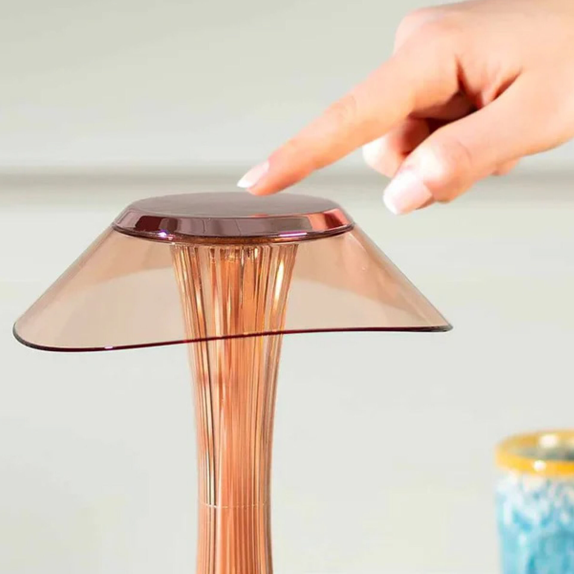 Lampada da tavolo dimerabile touch a LED. La lampada presenta una forma slanciata e sinuosa. La base è ampia e si restringe verso l’alto in un fusto sottile e curvilineo. Il paralume ha una forma leggermente a campana.