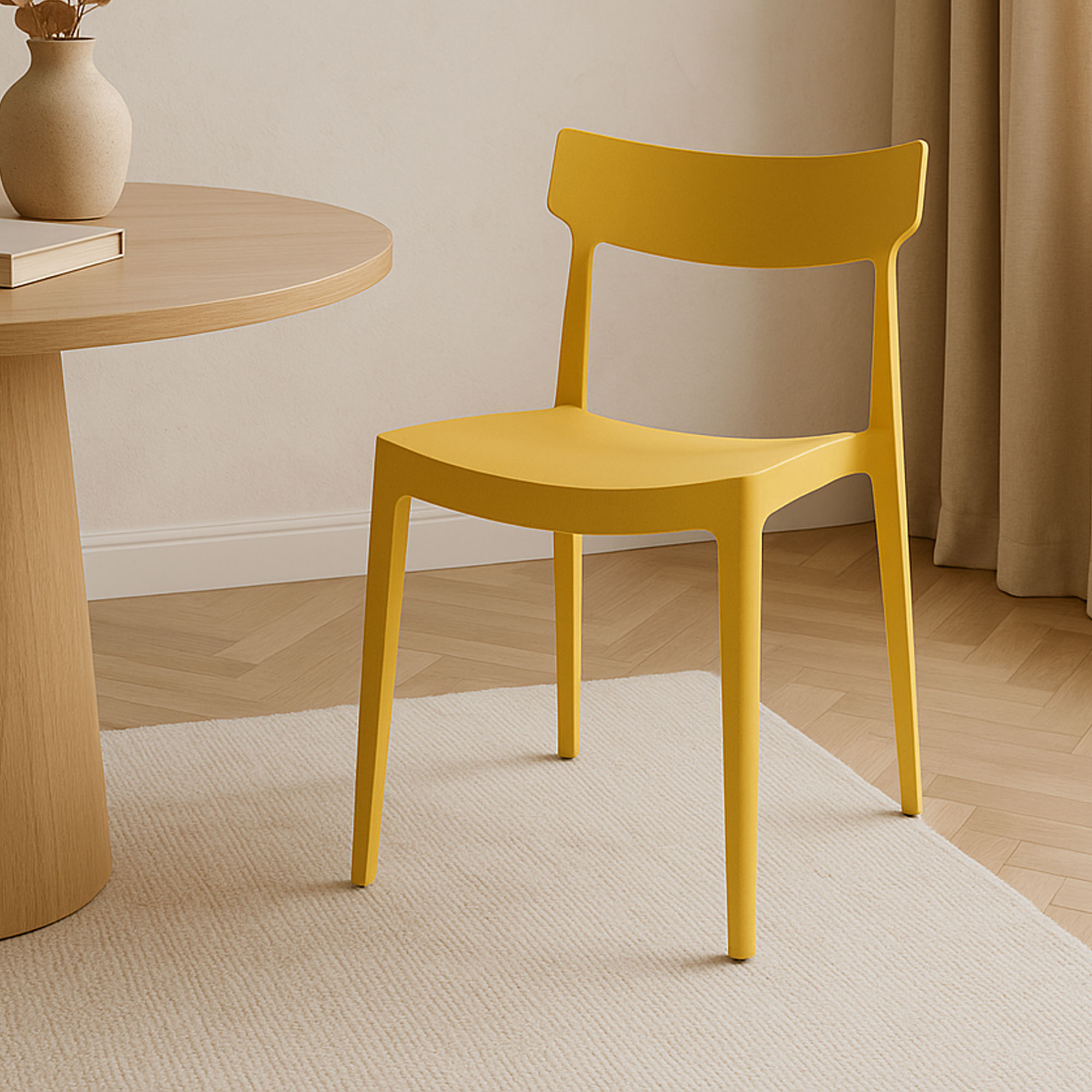 Sedie sinuose e dal design contemporaneo, si abbinano perfettamente a qualsiasi stile di arredamento. Lo schienale leggermente curvo, risulta particolarmente comodo, in quanto segue la conformazione della schiena al fine di assicurarvi un’esperienza di seduta sempre piacevole. Facilmente impilabili e veloci da pulire.